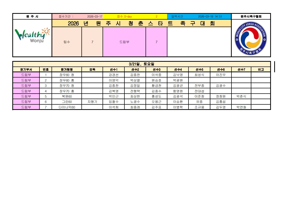 2026년 청춘스타트 족구대회 참가현황(최종) 작성자총무이사 이진우|작성시간26.03.19|조회수147 목록 댓글 0 글자크기 작게가 글자크기 크게가 다음검색 현재 게시글 추가 기능 열기 북마크 공유하기 신고 센터로 신고 댓글 댓글 0 댓글쓰기 답글쓰기 댓글 리스트
