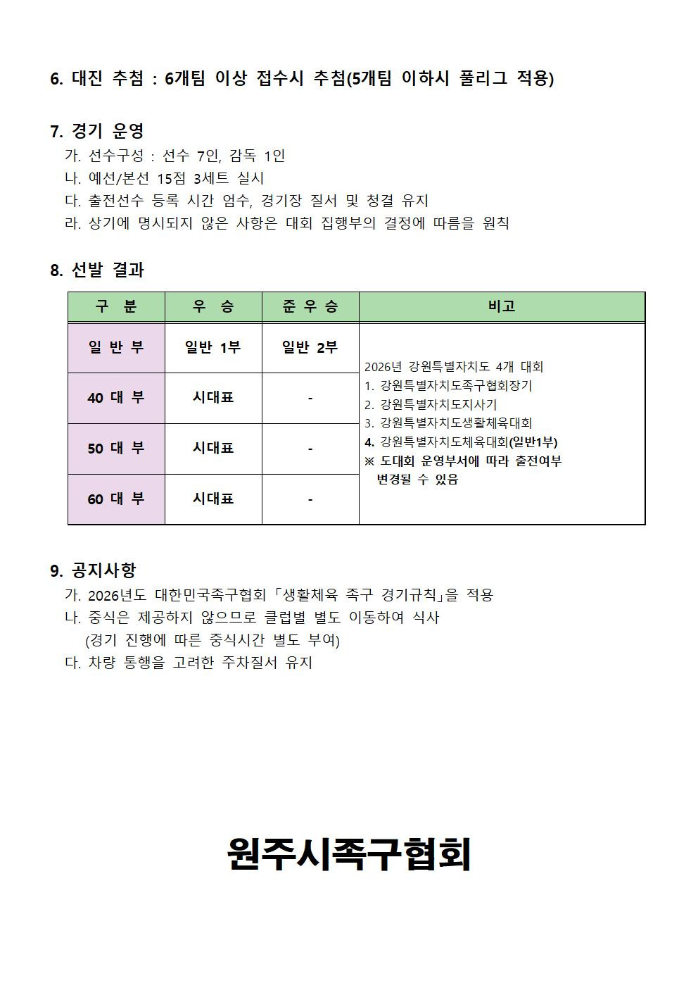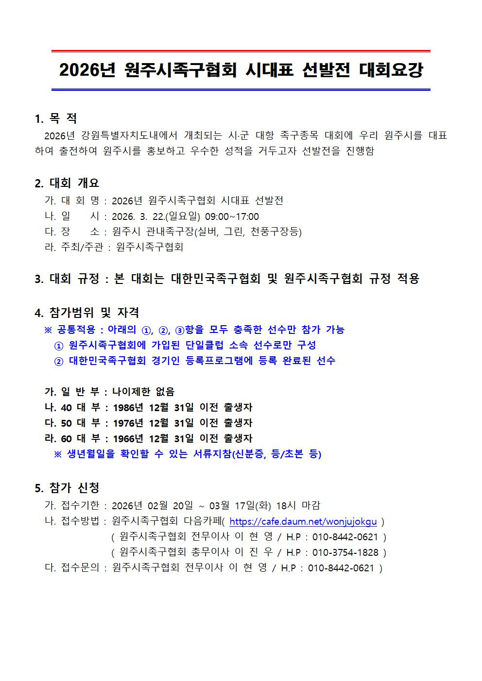 2026년 원주시족구협회 시대표 선발전 대회요강 작성자총무이사 이진우|작성시간26.02.20|조회수404 목록 댓글 1 글자크기 작게가 글자크기 크게가 2026년 원주시족구협회 시대표 선발전 대회요강.pdf94.98KB 첨부파일첨부된 파일이 3개 있습니다. jpg 파일 2026년 원주시족구협회 시대표 선발전 대회요강001.jpg 다운로드 jpg 파일 2026년 원주시족구협회 시대표 선발전 대회요강002.jpg 다운로드 pdf 파일 2026년 원주시족구협회 시대표 선발전 대회요강.pdf 다운로드 다음검색 현재 게시글 추가 기능 열기 북마크 공유하기 신고 센터로 신고 댓글 댓글 1 댓글쓰기 답글쓰기 댓글 리스트 작성자전부종 | 작성시간 26.03.16 《장우 시대표 선수 명단》감독-전부종50대-이정기 유봉균 최성식박종관 변상석 윤인동 정남일60대 -정용욱 김종찬 강경선이석중 박상렬 원승호 김낙영 댓글 전체보기