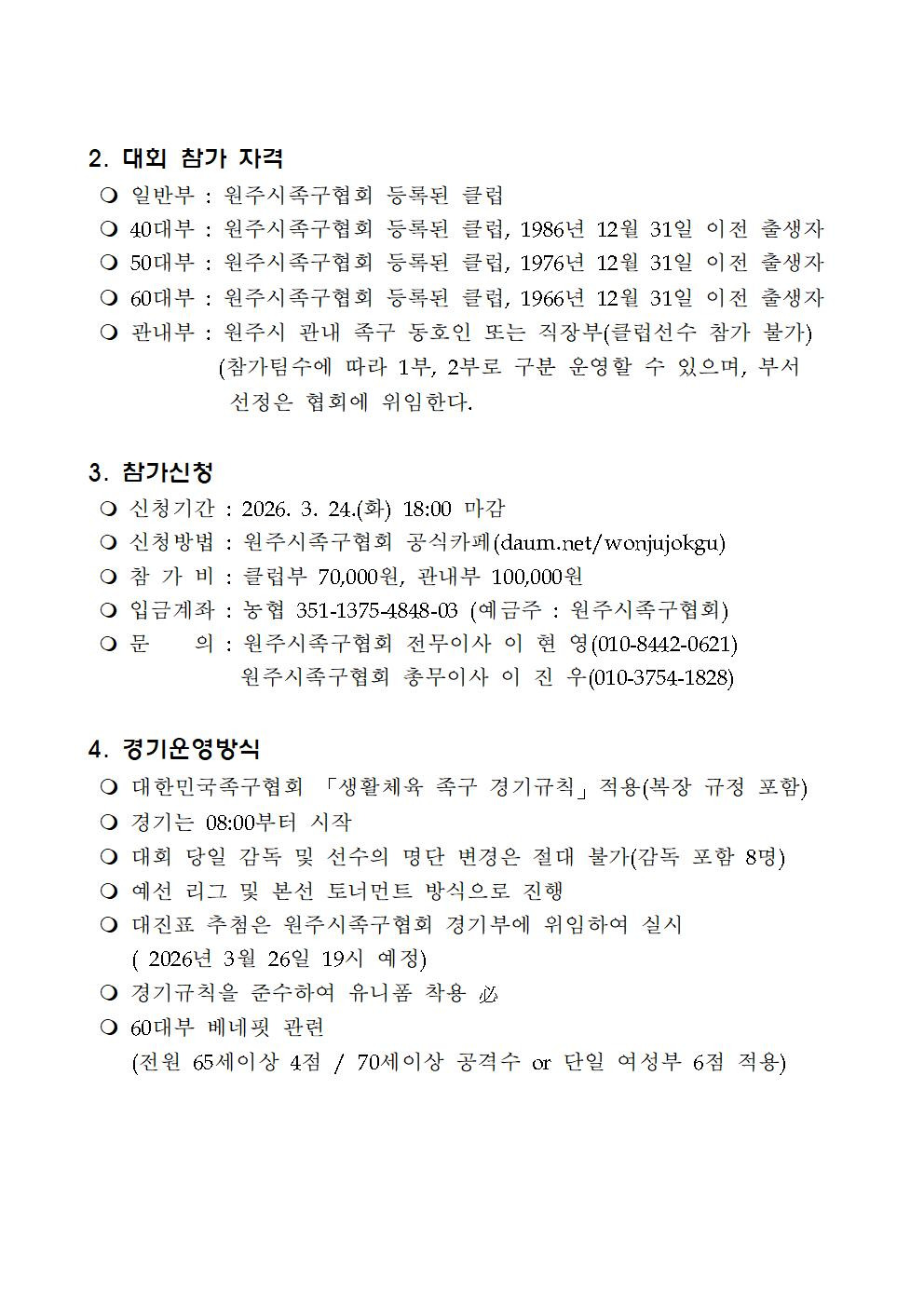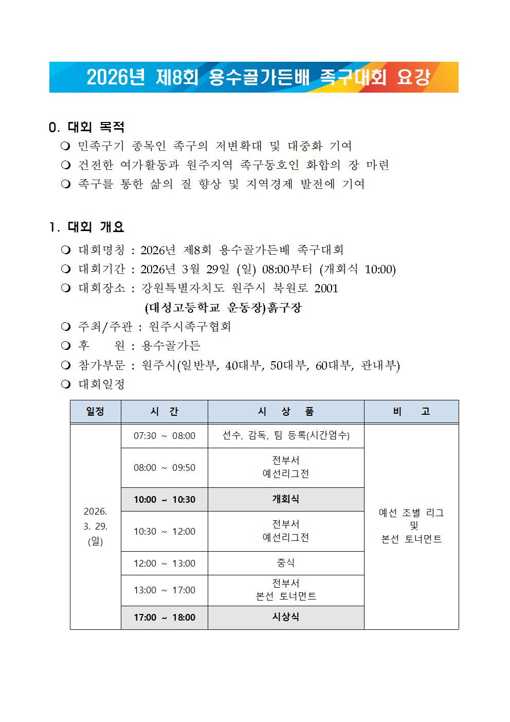 2026년 제8회 용수골가든배 족구대회_요강(수정) 작성자총무이사 이진우|작성시간26.03.06|조회수660 목록 댓글 0 글자크기 작게가 글자크기 크게가 2026년 제8회 용수골가든배 족구대회 요강.pdf171.60KB 첨부파일첨부된 파일이 5개 있습니다. jpg 파일 2026년 제8회 용수골가든배 족구대회 요강001.jpg 다운로드 jpg 파일 2026년 제8회 용수골가든배 족구대회 요강004.jpg 다운로드 jpg 파일 2026년 제8회 용수골가든배 족구대회 요강002.jpg 다운로드 jpg 파일 2026년 제8회 용수골가든배 족구대회 요강003.jpg 다운로드 pdf 파일 2026년 제8회 용수골가든배 족구대회 요강.pdf 다운로드 다음검색 현재 게시글 추가 기능 열기 북마크 공유하기 신고 센터로 신고 댓글 댓글 0 댓글쓰기 답글쓰기 댓글 리스트
