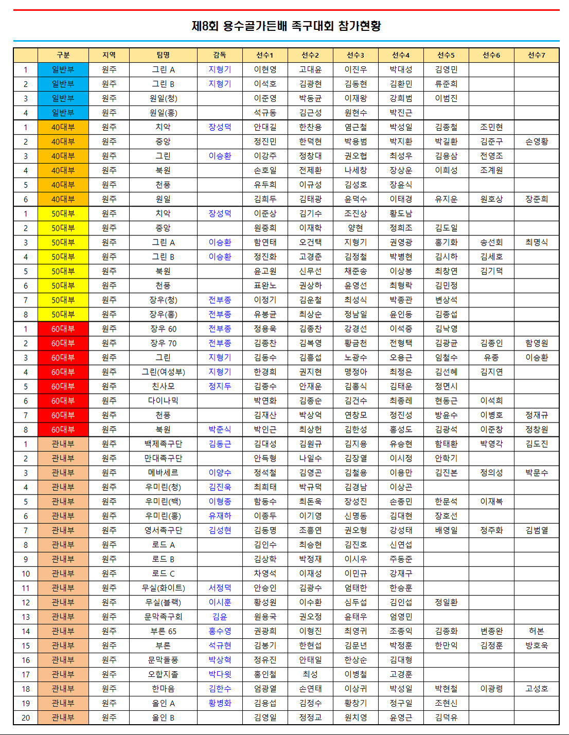 제8회 용수골가든배 족구대회 참가현황(접수 마감) 작성자경기이사 김영회|작성시간26.03.24|조회수719 목록 댓글 0 글자크기 작게가 글자크기 크게가 다음검색 현재 게시글 추가 기능 열기 북마크 공유하기 신고 센터로 신고 댓글 댓글 0 댓글쓰기 답글쓰기 댓글 리스트