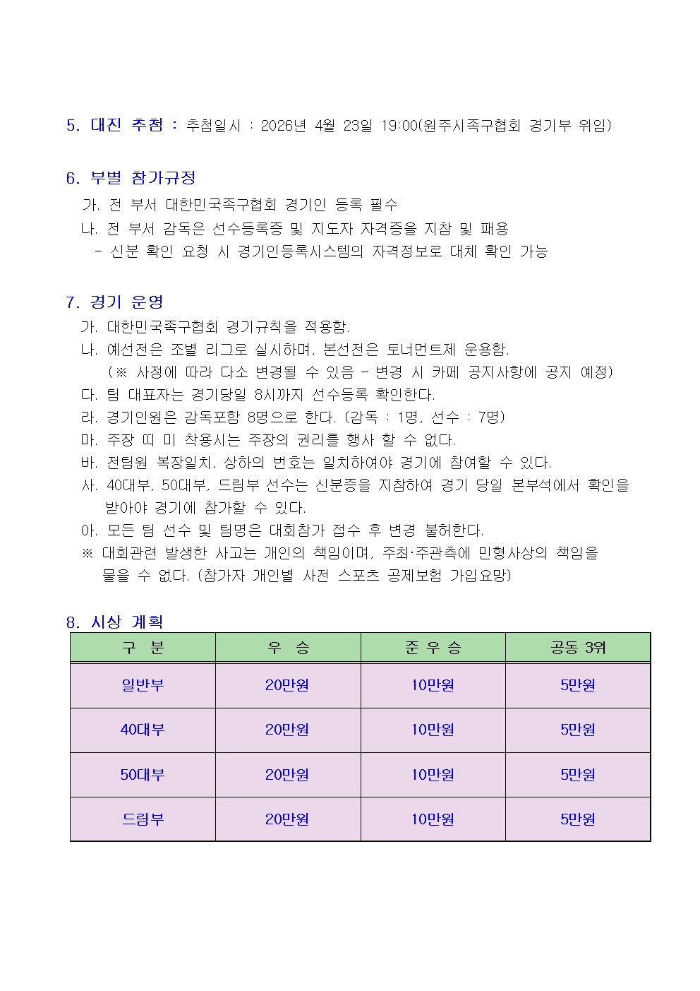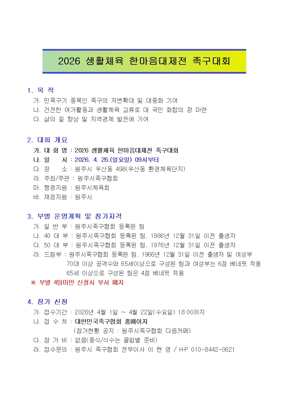 2026 생활체육 한마음대제전 족구대회 작성자총무이사 이진우|작성시간26.04.01|조회수280 목록 댓글 0 글자크기 작게가 글자크기 크게가 2026 생활체육 한마음대제전 족구대회_ 요강.pdf136.13KB 첨부파일첨부된 파일이 4개 있습니다. jpg 파일 2. 2026 생활체육 한마음대제전 족구대회_ 요강001.jpg 다운로드 jpg 파일 2. 2026 생활체육 한마음대제전 족구대회_ 요강003.jpg 다운로드 jpg 파일 2. 2026 생활체육 한마음대제전 족구대회_ 요강002.jpg 다운로드 pdf 파일 2026 생활체육 한마음대제전 족구대회_ 요강.pdf 다운로드 다음검색 현재 게시글 추가 기능 열기 북마크 공유하기 신고 센터로 신고 댓글 댓글 0 댓글쓰기 답글쓰기 댓글 리스트