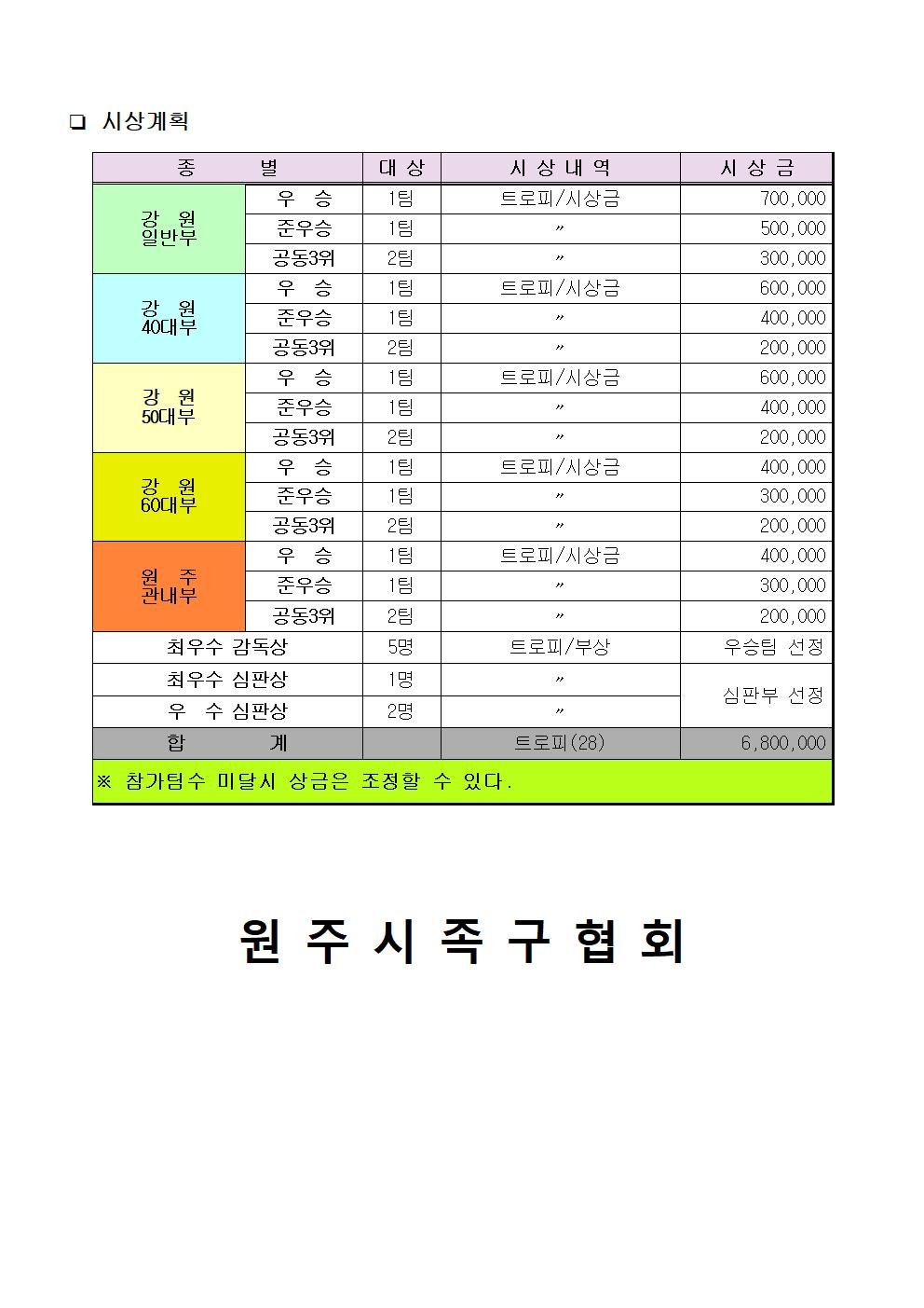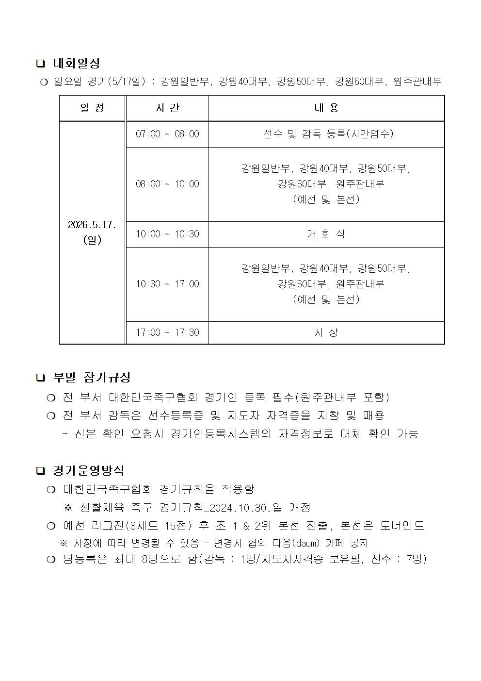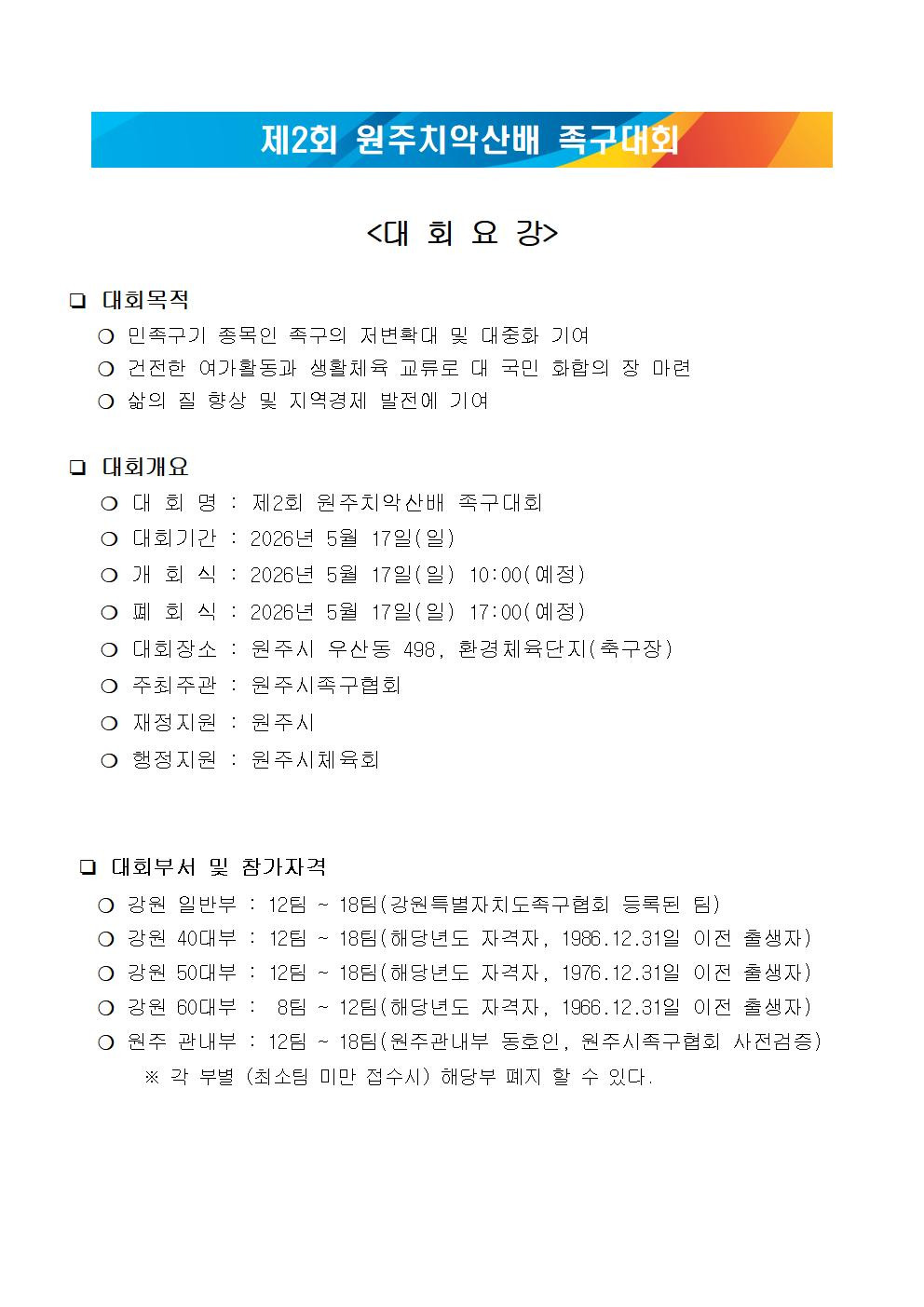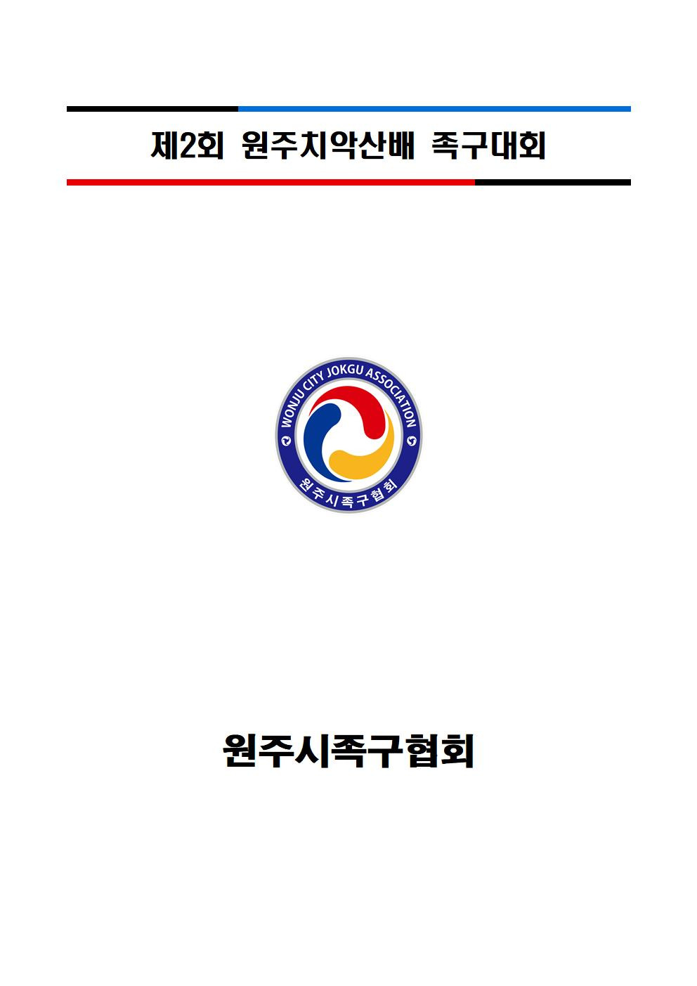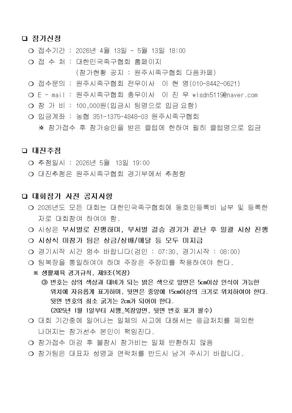 제2회 원주치악산배 족구대회 요강 작성자총무이사 이진우|작성시간26.04.15|조회수122 목록 댓글 0 글자크기 작게가 글자크기 크게가 제2회 원주치악산배 족구대회_요강.pdf126.96KB 첨부파일첨부된 파일이 6개 있습니다. jpg 파일 제2회 원주치악산배 족구대회_요강001.jpg 다운로드 jpg 파일 제2회 원주치악산배 족구대회_요강002.jpg 다운로드 jpg 파일 제2회 원주치악산배 족구대회_요강003.jpg 다운로드 jpg 파일 제2회 원주치악산배 족구대회_요강004.jpg 다운로드 jpg 파일 제2회 원주치악산배 족구대회_요강005.jpg 다운로드 pdf 파일 제2회 원주치악산배 족구대회_요강.pdf 다운로드 다음검색 현재 게시글 추가 기능 열기 북마크 공유하기 신고 센터로 신고 댓글 댓글 0 댓글쓰기 답글쓰기 댓글 리스트
