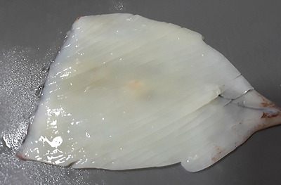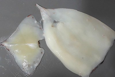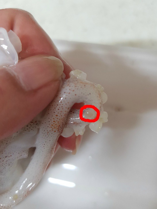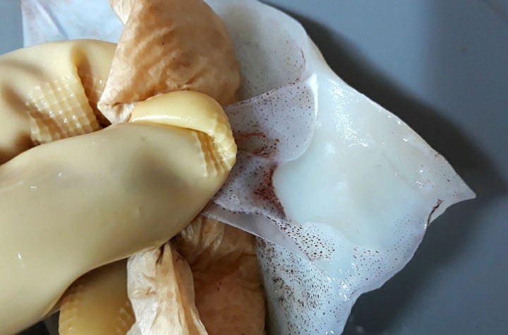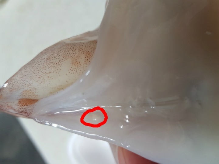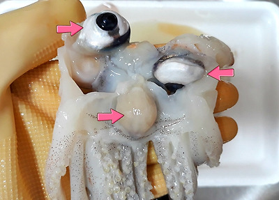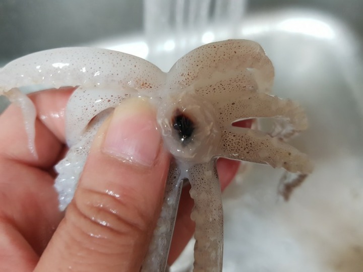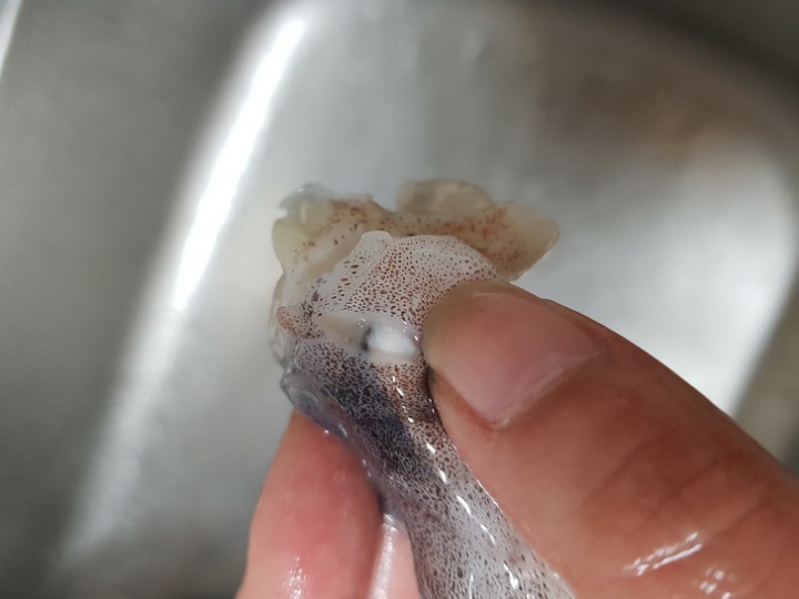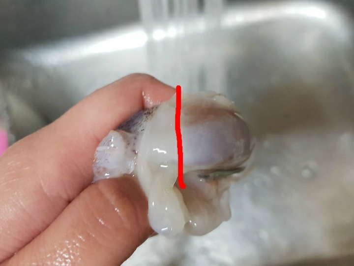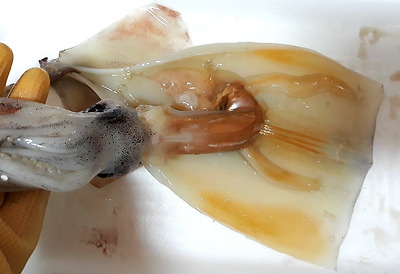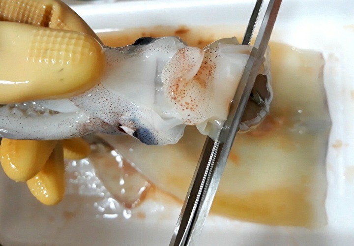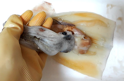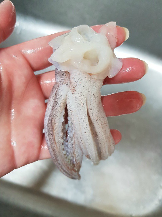 - 5. 데친 오징어의 안쪽에 녹말가루를 바르고 ②를 속에 채워 넣는다.