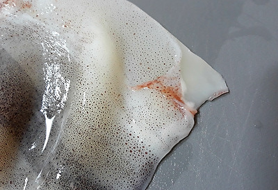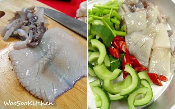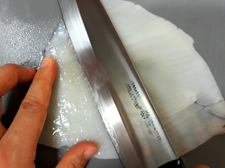 오징어는 채 썰듯이 가늘게 썰어야 다른 재료와 간도 비슷하게 배고 해초와 함께 씹을 때 질감이 좋다. 데친 오징어는 흐르는 물에 재빨리 헹군 후 체에 담아 그대로 식혀야 맛이 빠져나가지 않는다. |