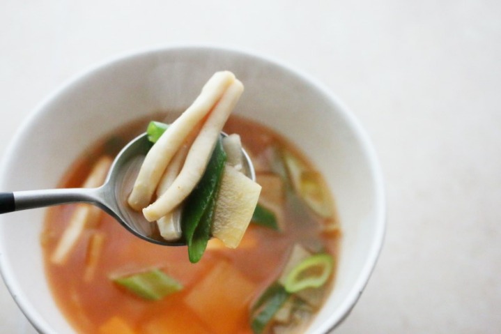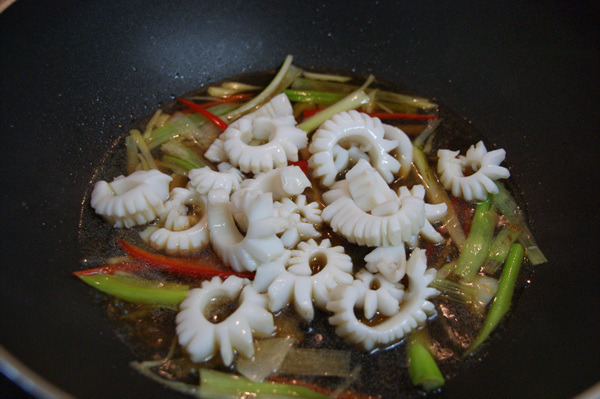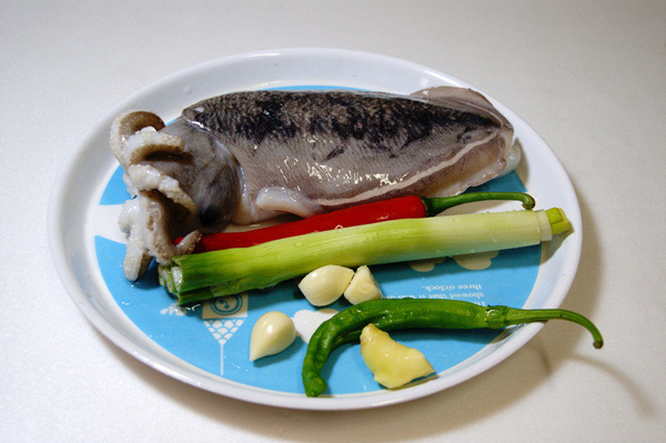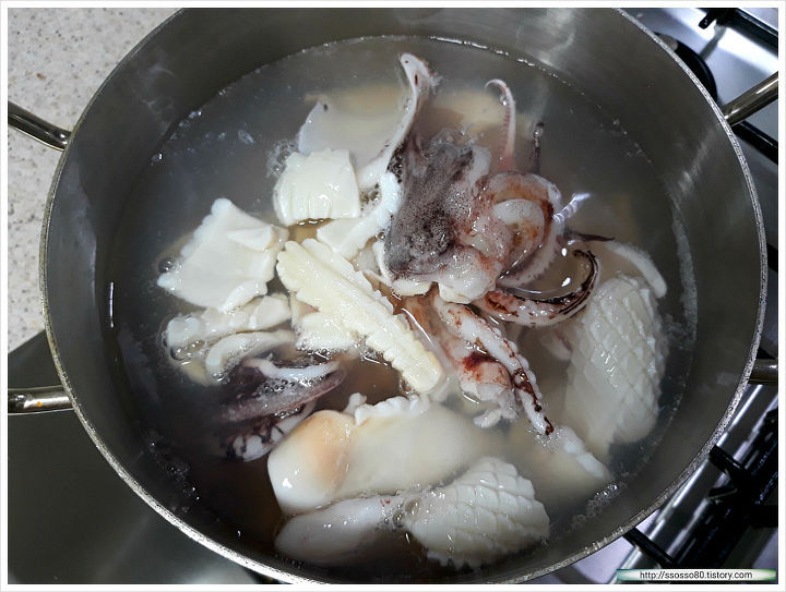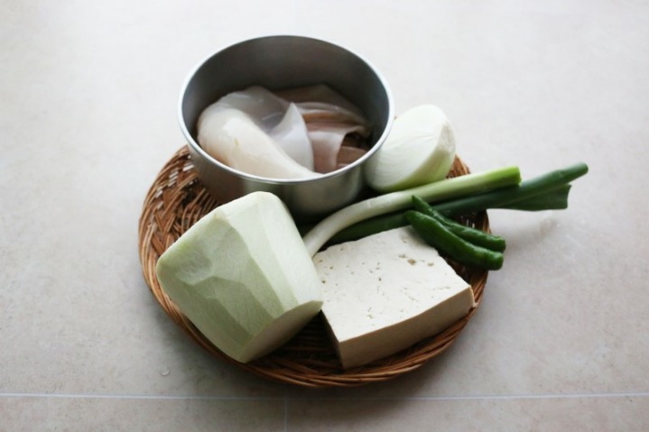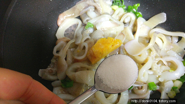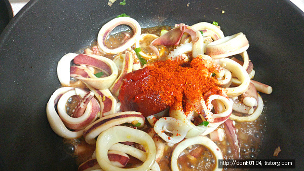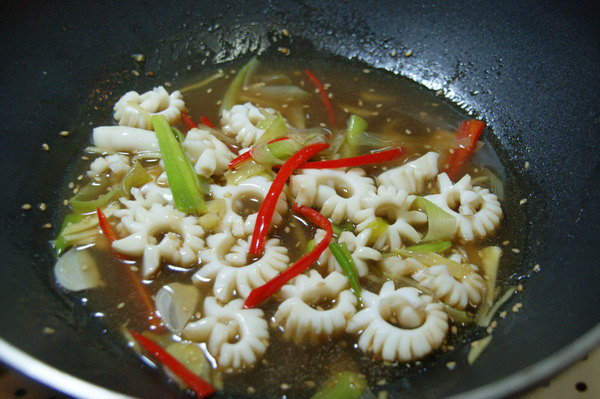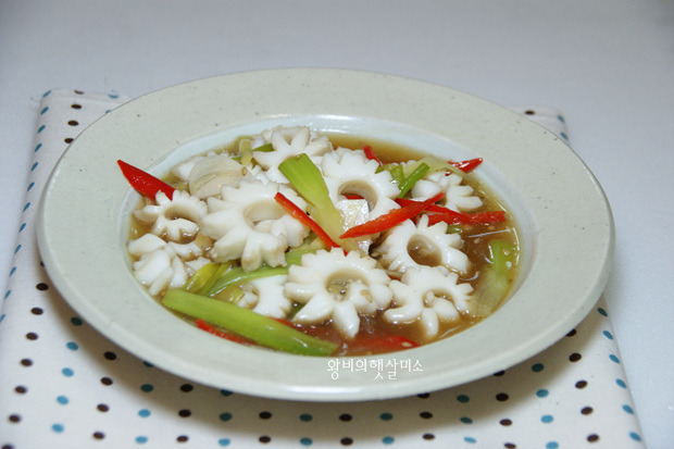 - 5. ④에 오징어를 넣고 익힌 후 대파, 청양고추, 홍고추를 넣고 소금, 후춧가루로 간을 맞춘다.