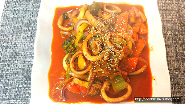 - 6. ⑤의 채소가 반쯤 익으면 손질해놓은 ①의 오징어를 넣고 센 불에서 볶은 후 접시에 담아 소면을 곁들인 뒤 통깨를 뿌려 낸다.