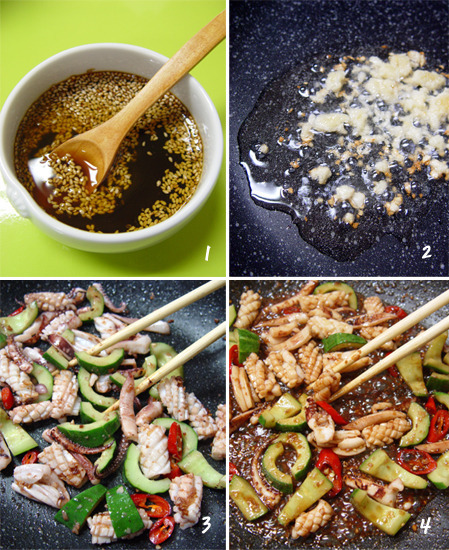 오징어와 캐슈너트를 미리 익혀 잡내를 없애고 고소한 맛을 살리는 과정이 필요한데 이를 중식에서는 ‘화’시킨다고 표현한다. 양념A의 향 채소를 충분히 볶은 후 나머지 양념을 넣어야 향이 풍부한 중국풍의 오징어 요리를 즐길 수 있다.