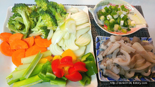 - 3. 양파는 2×2cm 크기로 자르고 브로콜리는 송이를 나누어 소금물에 데쳐 식혀놓는다.