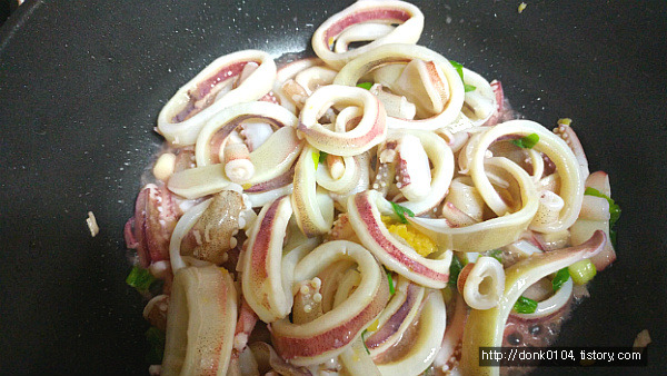 - 4. 냄비에 올리브유를 두르고 마늘과 양파를 볶아 향을 낸 후 화이트와인과 오징어를 넣고 볶는다.