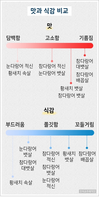 수산물 플랫폼 인어교주해적단에 따르면 "기름지고 고소한 맛을 좋아하는 사람의 경우 대체로 참다랑어를 좋아하지만 황새치의 뱃살도 고소한 맛이 난다"며 "무조건 비싼 수산물을 고르기 보다는 좋아하는 식감이나 맛에 따라 합리적으로 고르는 것이 좋다"라고 전했다.