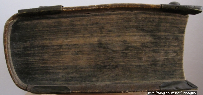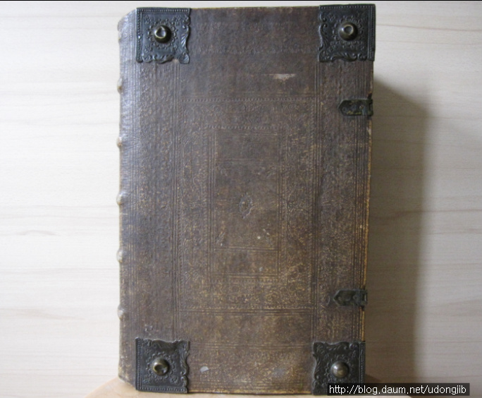 책의 표지는 두꺼운 가죽으로 만들어졌으며, 네 귀퉁이를 동으로 덮었습니다.