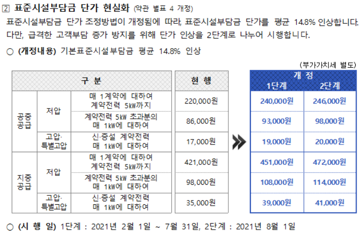 급격한 고객부담 증가 방지를 위해 2단계로 나누어 표준시설부담금을 인상하기로 하였습니다.