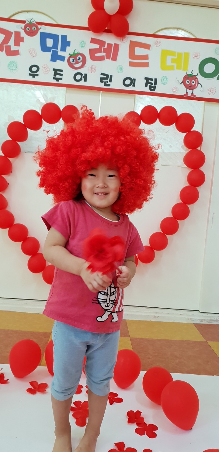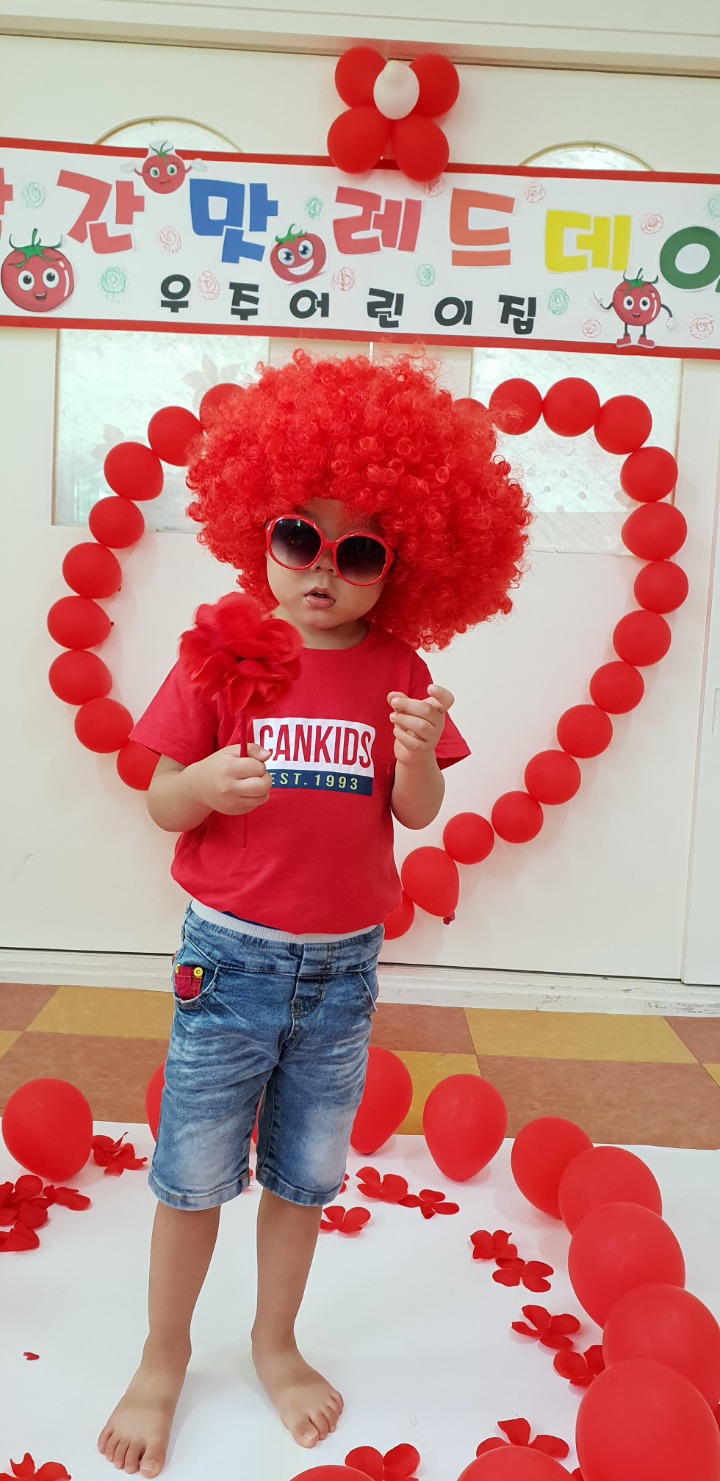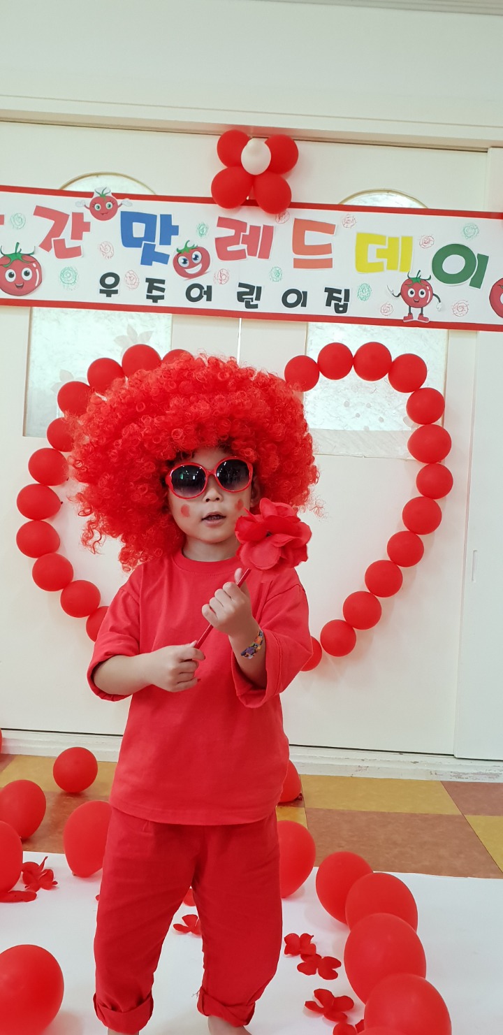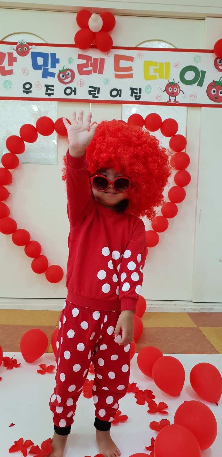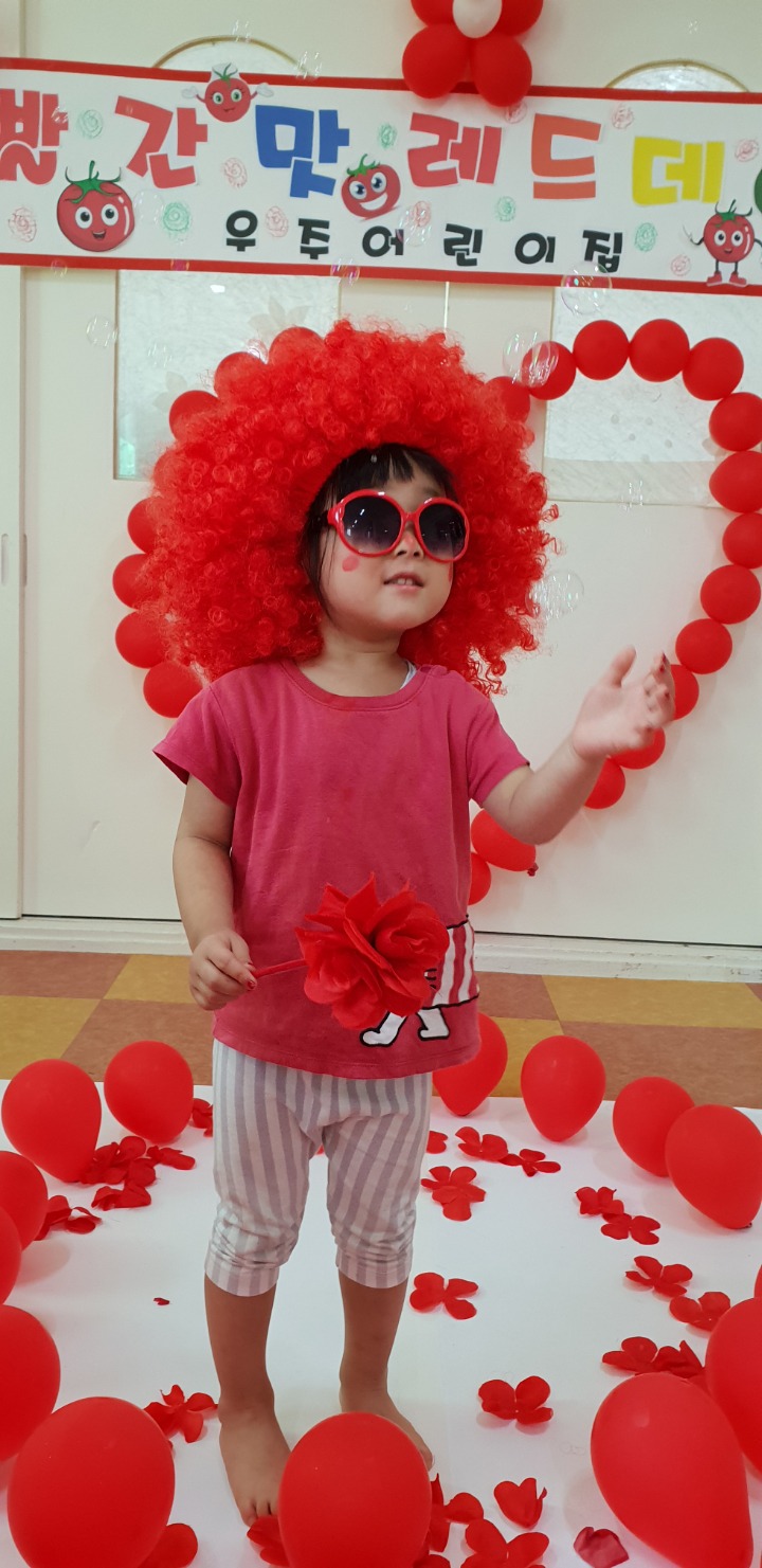 빨강색 옷을 입고 등원한 친구들 어린이 집에오니 현관에는 빨강풍선들이 가득하고 빨간토마토에 빨간 레드카펫이 우리 친구들을 맞이 합니다 레드카펫에 가서는 멋진 가발과 안경을 쓰고 포즈를 취하며 사진을 찍고 가루야 가루야 방으로 이동 핑크색 밀가루반죽을 주물럭거리고 모양틀에 넣어 예쁜 모양도 만들어 보았어요 그다음으로는 토마토 밟기를 하는시간 우리 친구들 처음에는 들어가지 않으려고 하더니 들어가서는 그래도 토마토를 밟아 주네요~~~