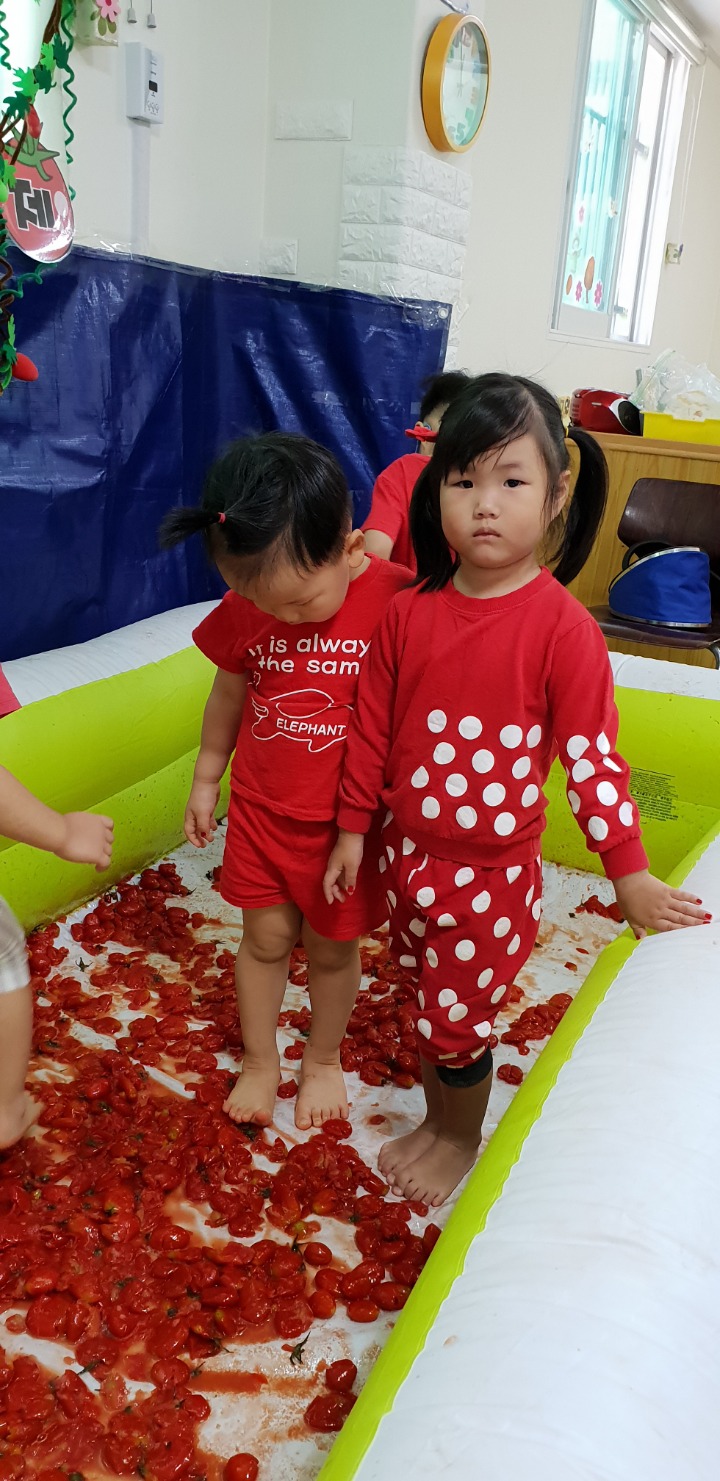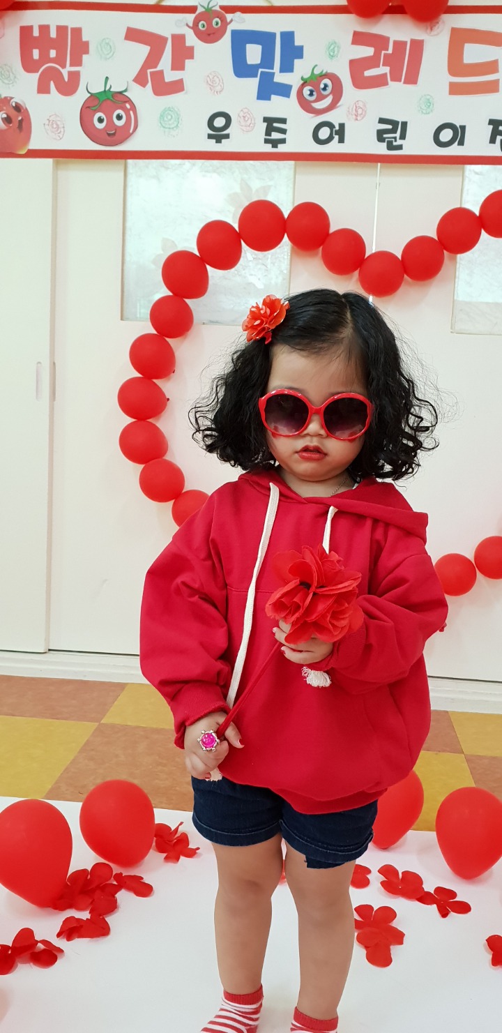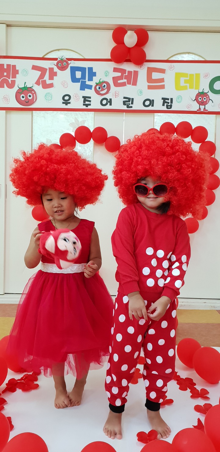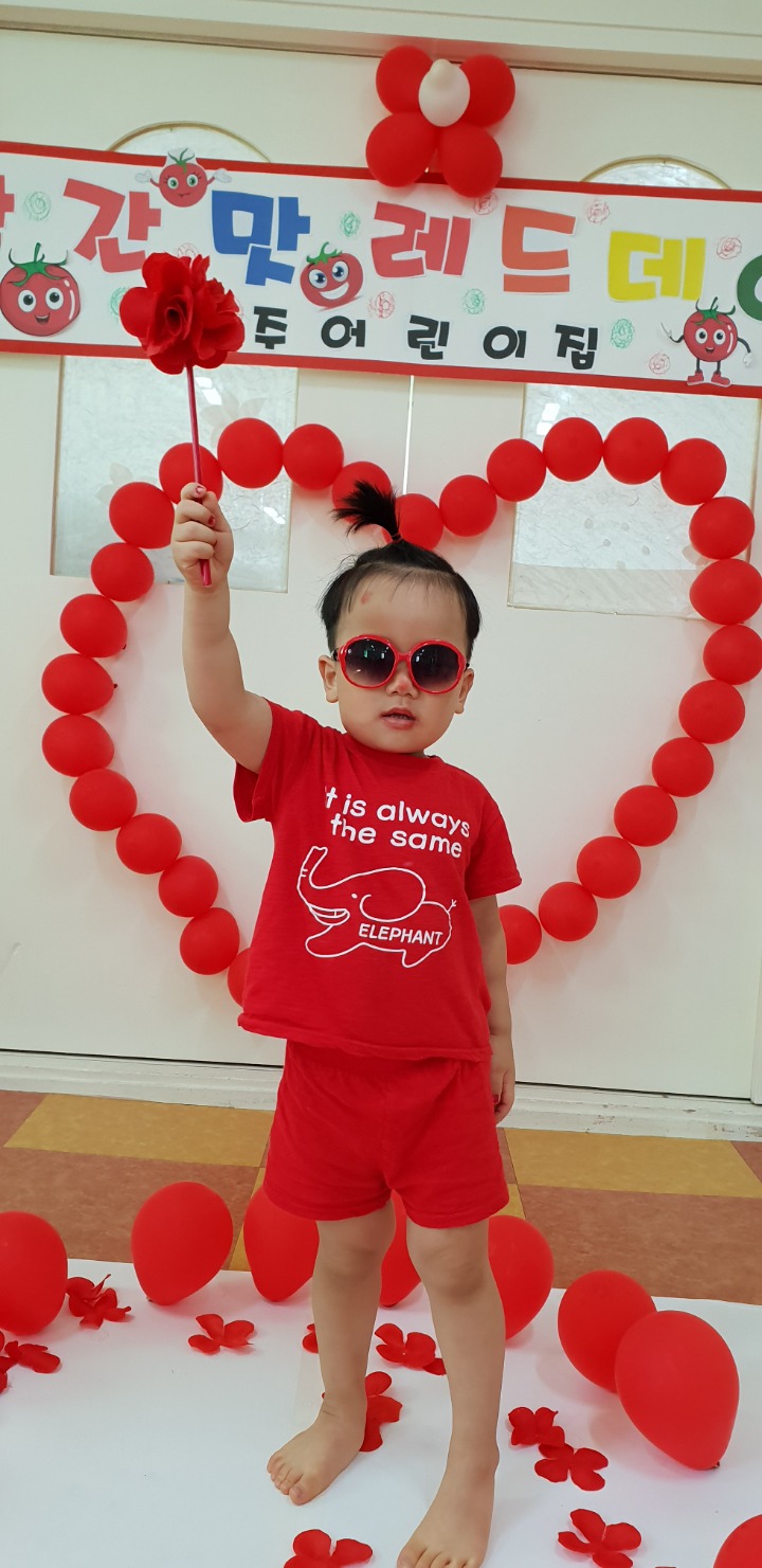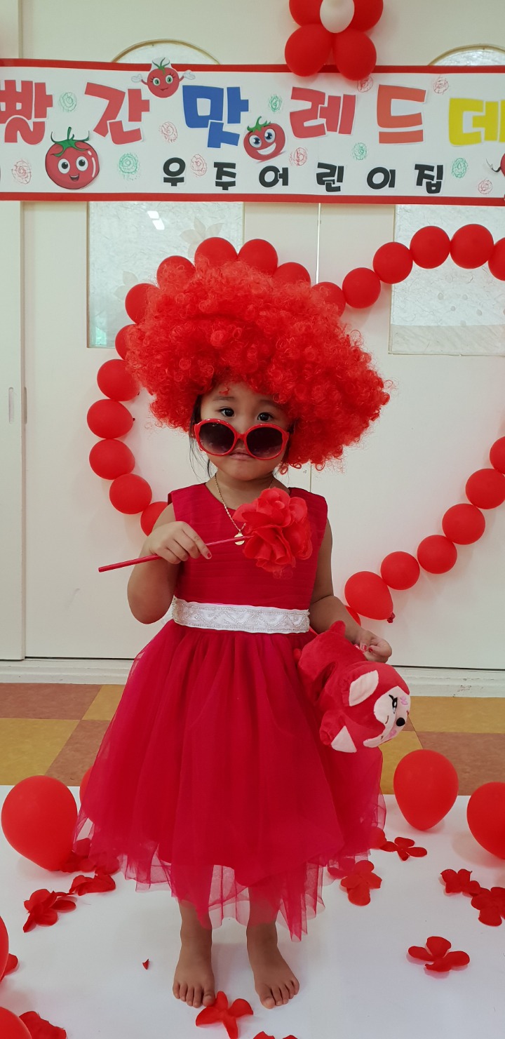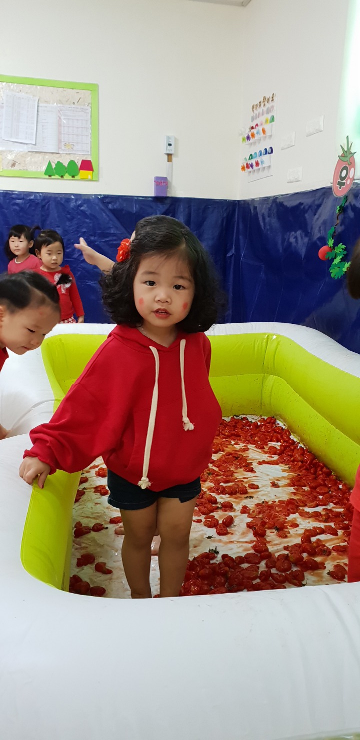 빨강색 옷을 입고 등원한 친구들 어린이 집에오니 현관에는 빨강풍선들이 가득하고 빨간토마토에 빨간 레드카펫이 우리 친구들을 맞이 합니다 레드카펫에 가서는 멋진 가발과 안경을 쓰고 포즈를 취하며 사진을 찍고 가루야 가루야 방으로 이동 핑크색 밀가루반죽을 주물럭거리고 모양틀에 넣어 예쁜 모양도 만들어 보았어요 그다음으로는 토마토 밟기를 하는시간 우리 친구들 처음에는 들어가지 않으려고 하더니 들어가서는 그래도 토마토를 밟아 주네요~~~