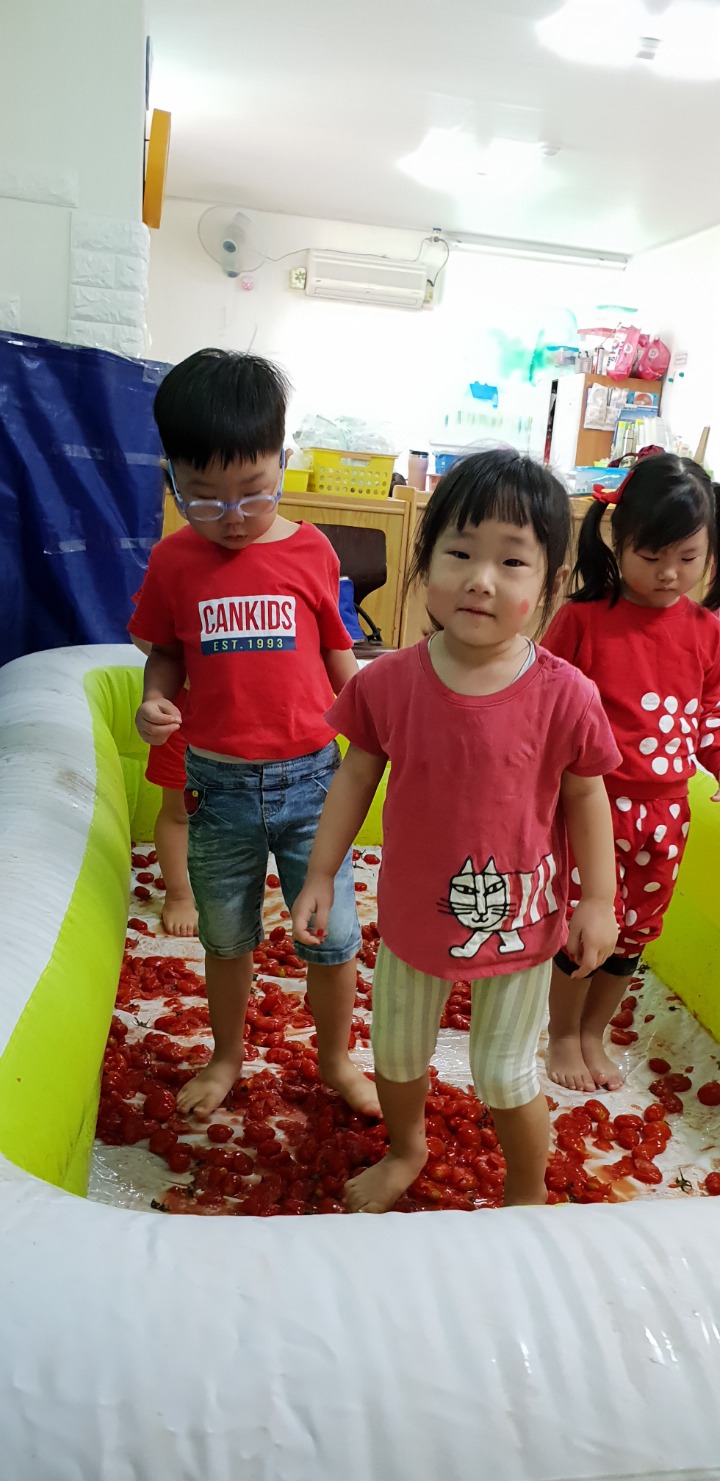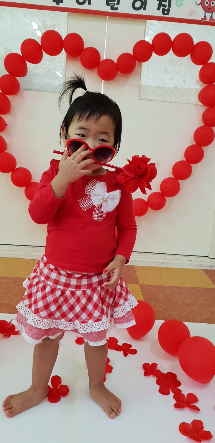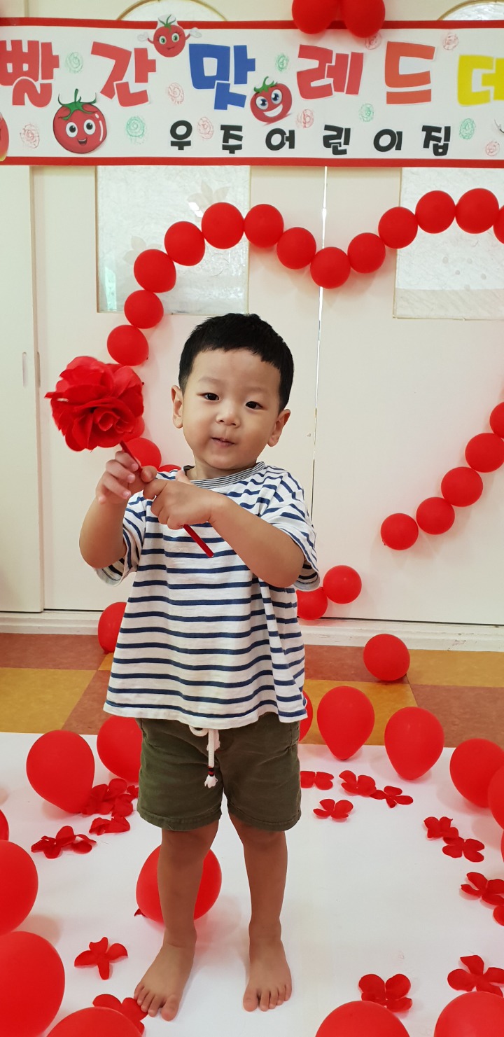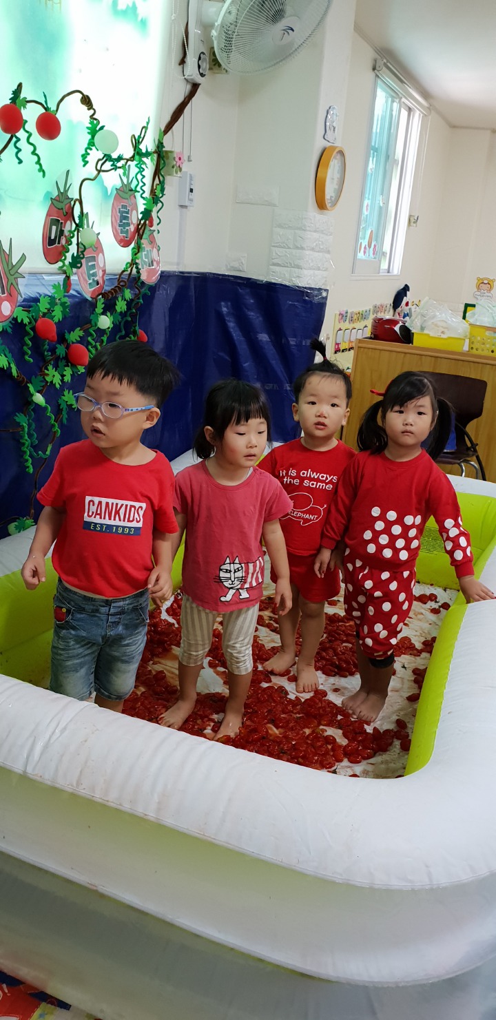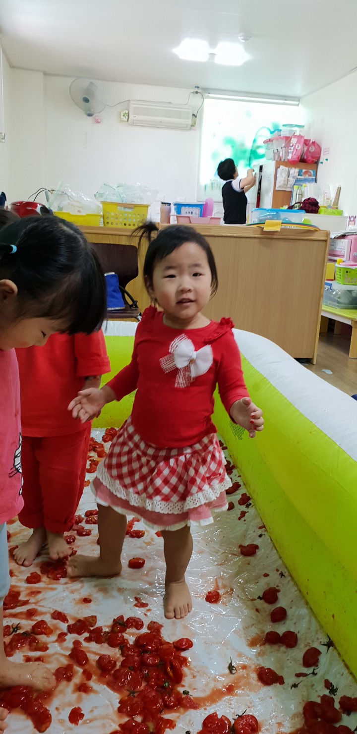 빨강색 옷을 입고 등원한 친구들 어린이 집에오니 현관에는 빨강풍선들이 가득하고 빨간토마토에 빨간 레드카펫이 우리 친구들을 맞이 합니다 레드카펫에 가서는 멋진 가발과 안경을 쓰고 포즈를 취하며 사진을 찍고 가루야 가루야 방으로 이동 핑크색 밀가루반죽을 주물럭거리고 모양틀에 넣어 예쁜 모양도 만들어 보았어요 그다음으로는 토마토 밟기를 하는시간 우리 친구들 처음에는 들어가지 않으려고 하더니 들어가서는 그래도 토마토를 밟아 주네요~~~