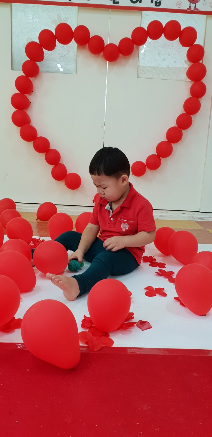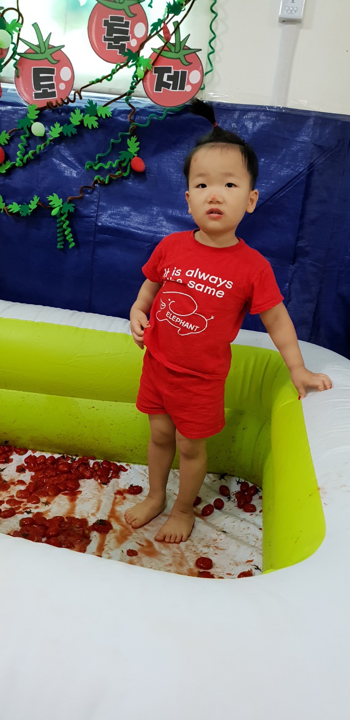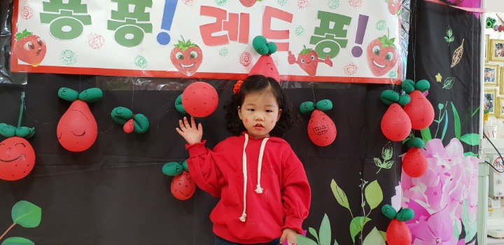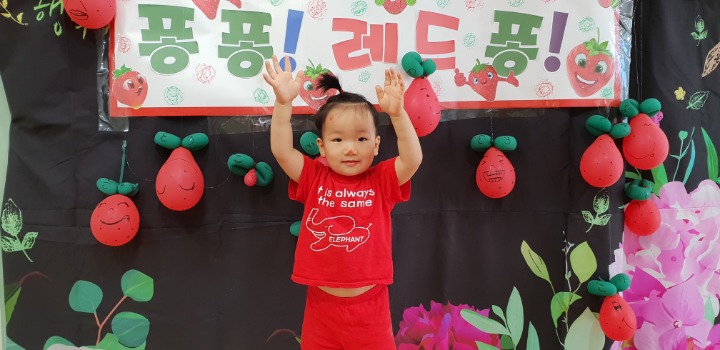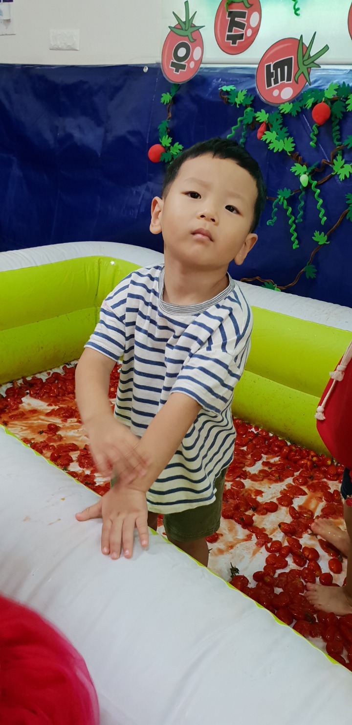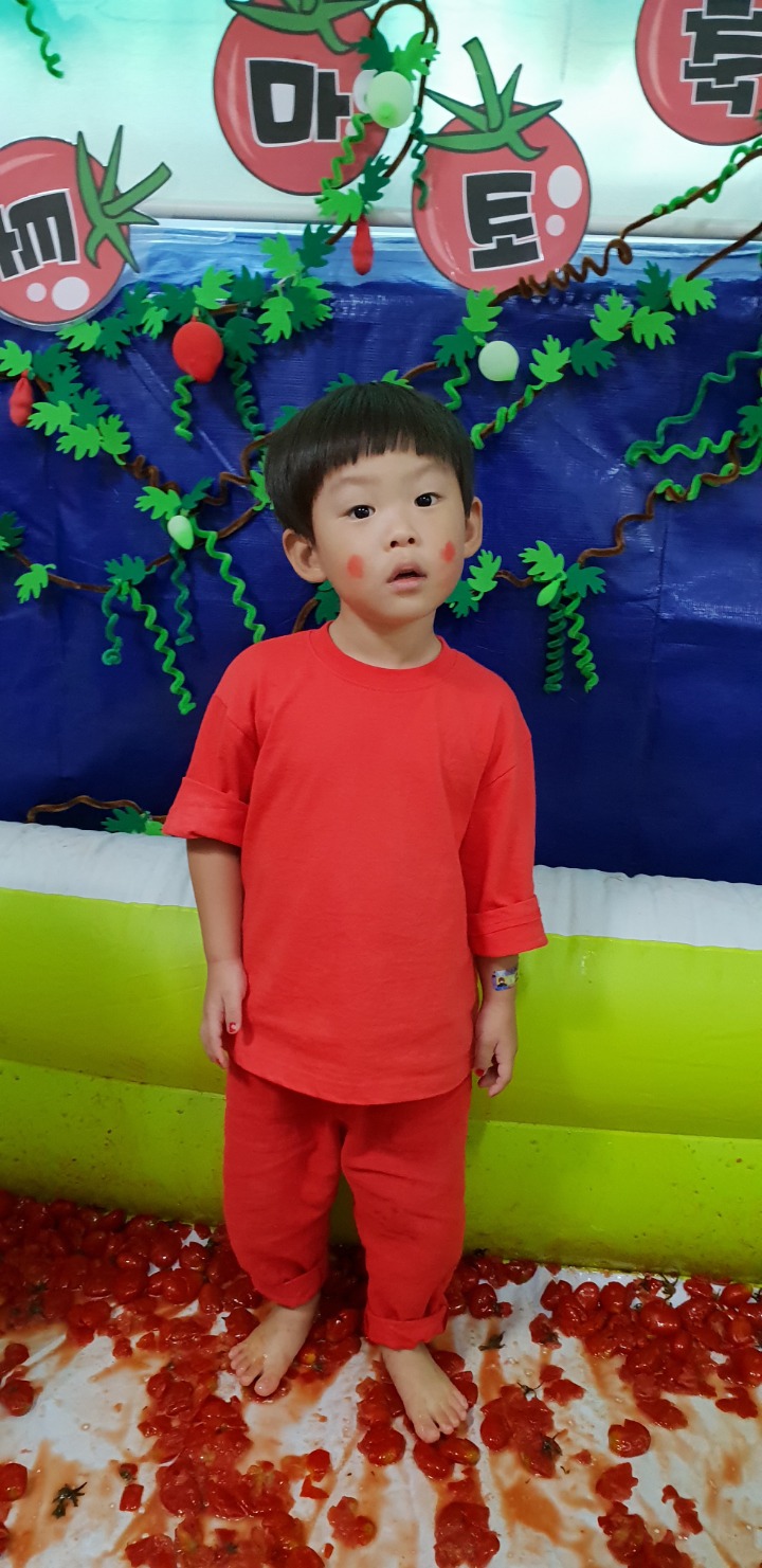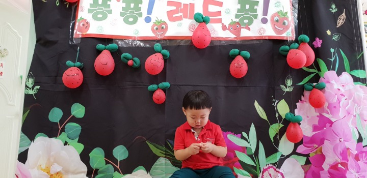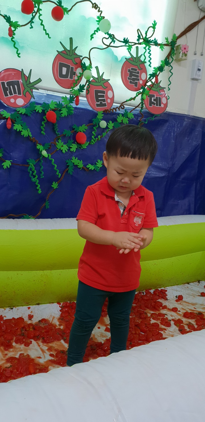 빨강색 옷을 입고 등원한 친구들 어린이 집에오니 현관에는 빨강풍선들이 가득하고 빨간토마토에 빨간 레드카펫이 우리 친구들을 맞이 합니다 레드카펫에 가서는 멋진 가발과 안경을 쓰고 포즈를 취하며 사진을 찍고 가루야 가루야 방으로 이동 핑크색 밀가루반죽을 주물럭거리고 모양틀에 넣어 예쁜 모양도 만들어 보았어요 그다음으로는 토마토 밟기를 하는시간 우리 친구들 처음에는 들어가지 않으려고 하더니 들어가서는 그래도 토마토를 밟아 주네요~~~