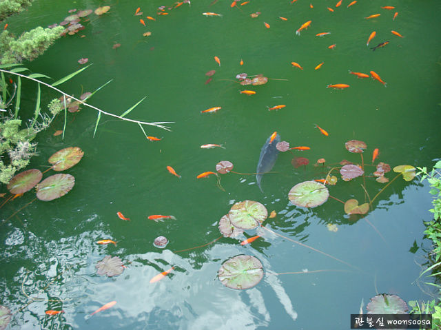 그 아래로 연못에 한가롭게 노니는 물고기 떠있는 수련잎과 어우러져 참 예뻤고