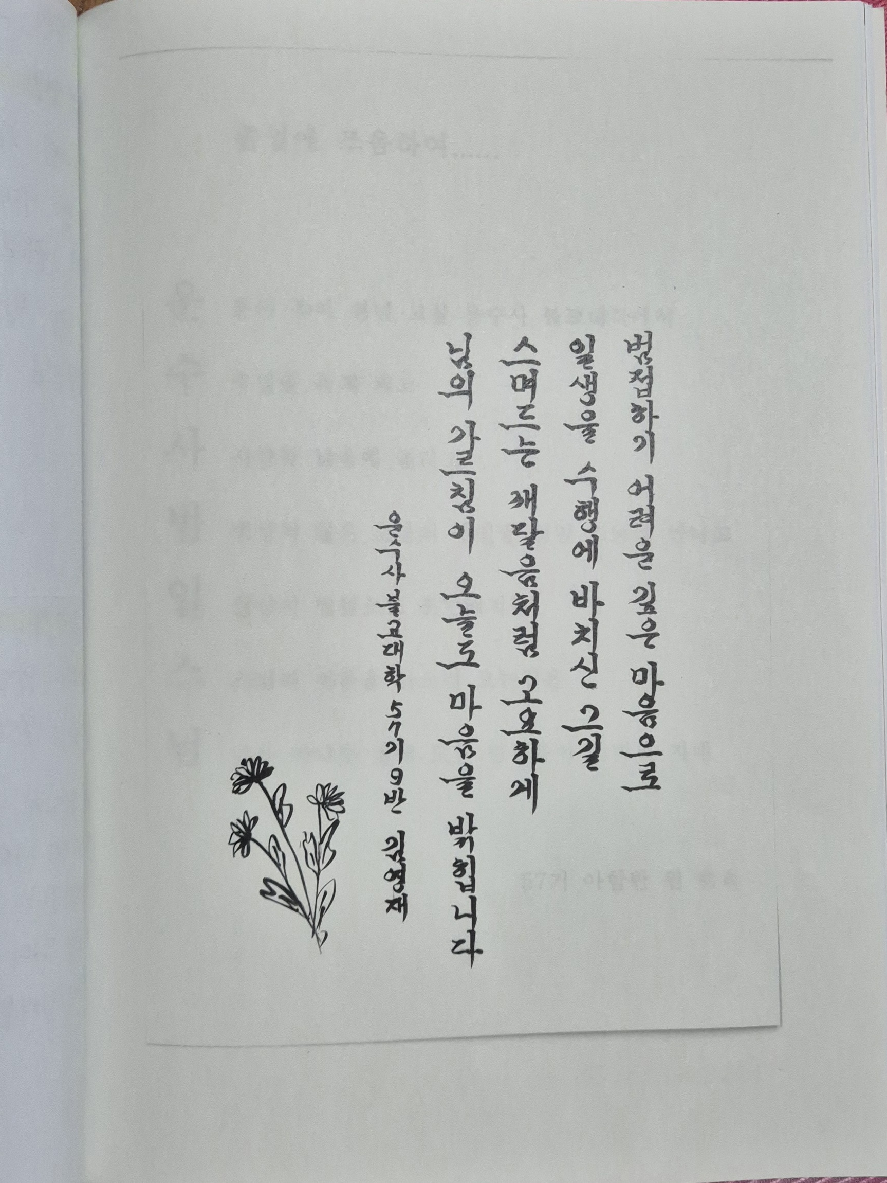 57기 9반 김 영 재 작성자김현경화(바라밀)|작성시간25.12.25|조회수9 목록 댓글 0 글자크기 작게가 글자크기 크게가 범접하기 어려운 길은 마음으로일생을 수행에 바치신 그길스며드는 깨달음처럼 고요하게님의 가르침이 오늘도 마음을 밝힙니다 운수사 불교대학 57기 9반 김 영 재 다음검색 현재 게시글 추가 기능 열기 북마크 공유하기 신고 센터로 신고 댓글 댓글 0 댓글쓰기 답글쓰기 댓글 리스트