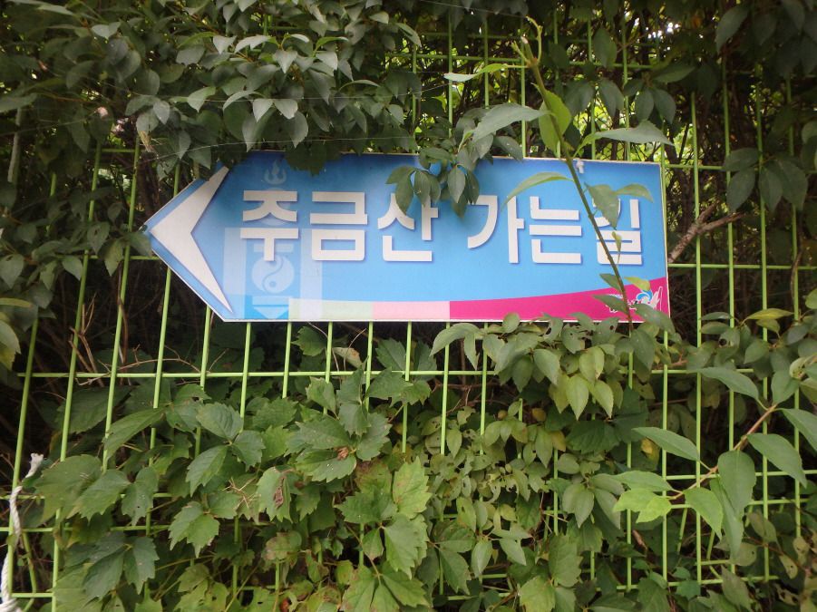 (09;27) 이정표(주금산 가는길)표시판이 녹색철망울타리에 걸려있습니다.