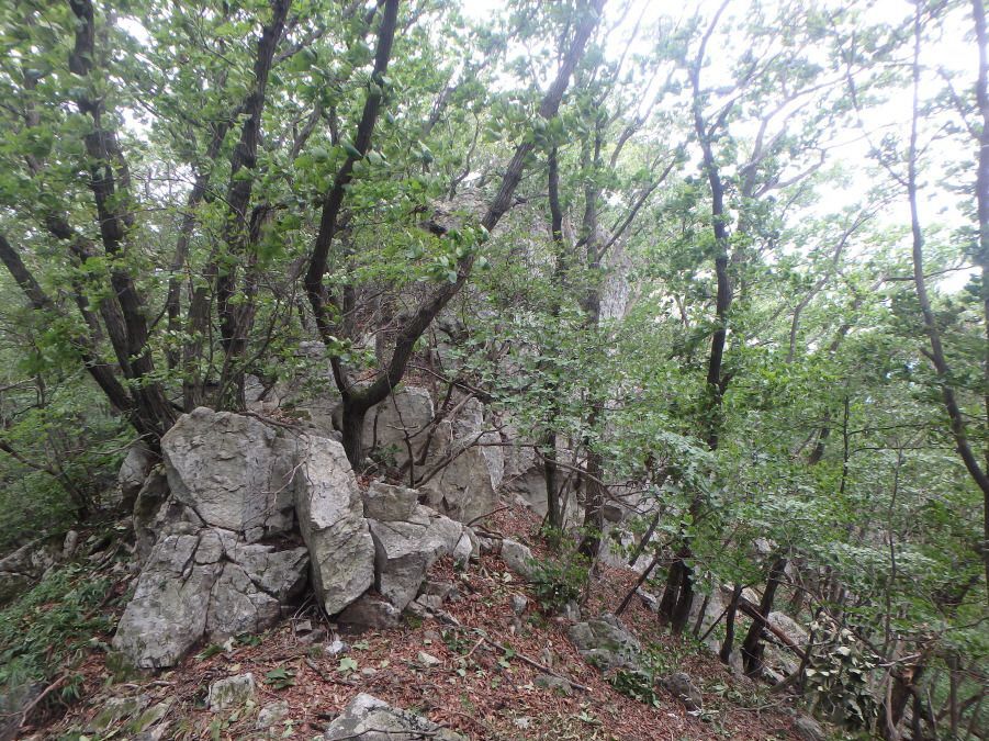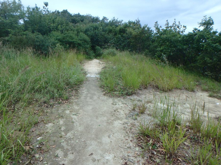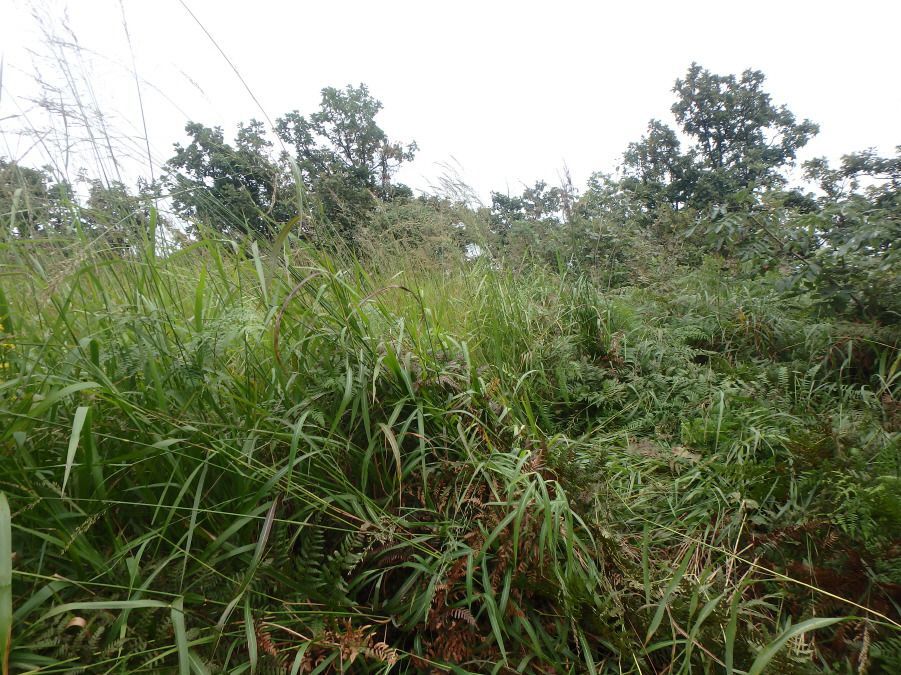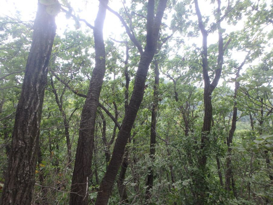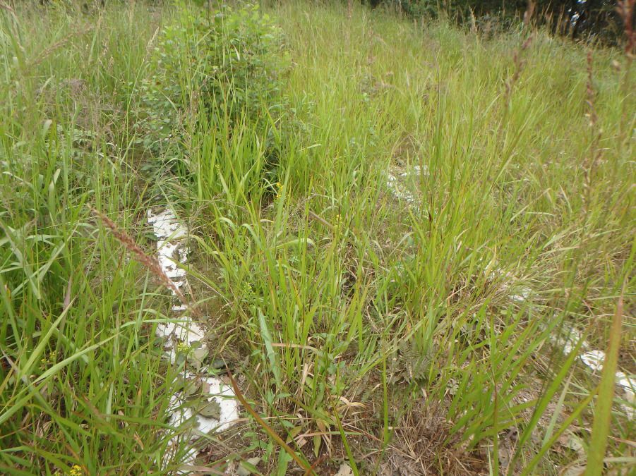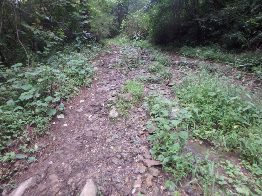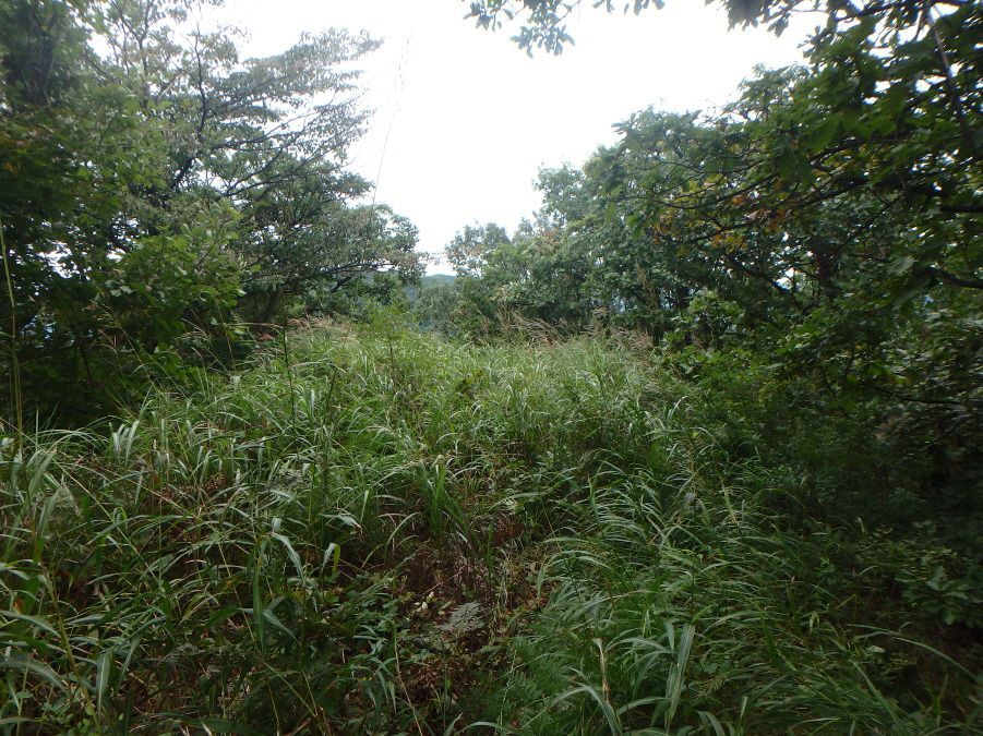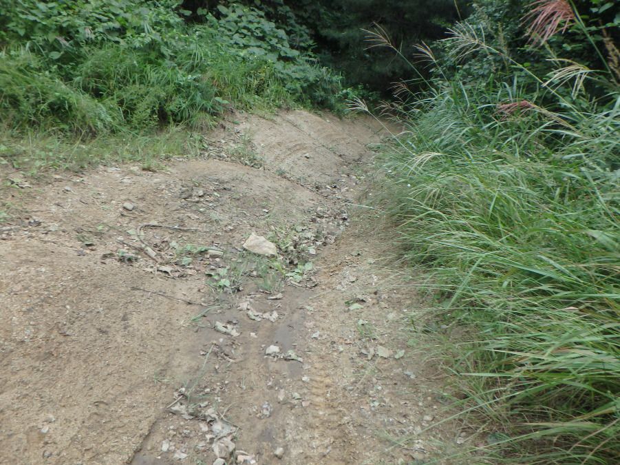 완만한 능선내림길 내려서 (12;50) 능선 갈림길 이정표(개주산1.8km/주금산 2.8km에서 우측으로 90 도 우향(cf.독도주의지역) 내림능선길 따른다. (12;51)억새가 웃자라 등로가 불분명한 지역을 통과하여 픽스로프 잡고 임도에 내려선다[3.3km][80분]
