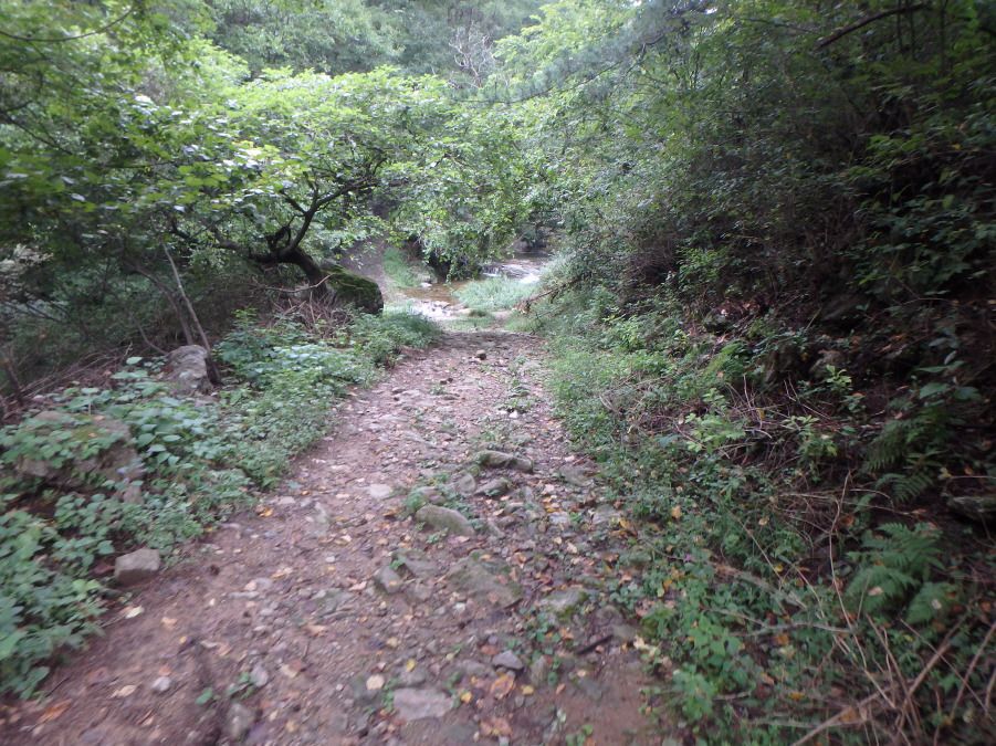 등산로는 산마루(휴양림, 캠핑장) 산장 건물을 통과한다. 도로따라 건물 안을 나오면 줄에 묶여 있는 개가 짖는다. 산마루 산장을 통과한 후에 뒤돌아서 보면 철문이 닫힌 쪽이 오르막 갈림길에서 우측 오토캠핑장 방향으로 진행하는 길이다. 임도 따라조금 더 오니 길이 갈라지는데 (cf.우측 포장길은 임산물 채취금지 현수막과 함께 펜스망이 쳐져 있다.) 좌측으로 진행 (09;49)이정표(주금산정상3.76km/비금리0.70km)를 지나 계곡을 건너서 걷고 우측 아래로 계곡을 끼고 한동안 이어지는 등로를 따른다.