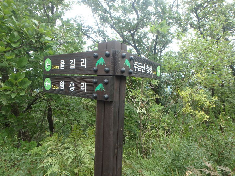 (13;35~13;40)[5분] 개주산 정상 이정표(율길리3.4km/원흥리3.5km/주금산정상4.6km)입니다.