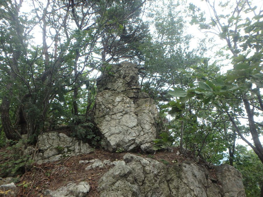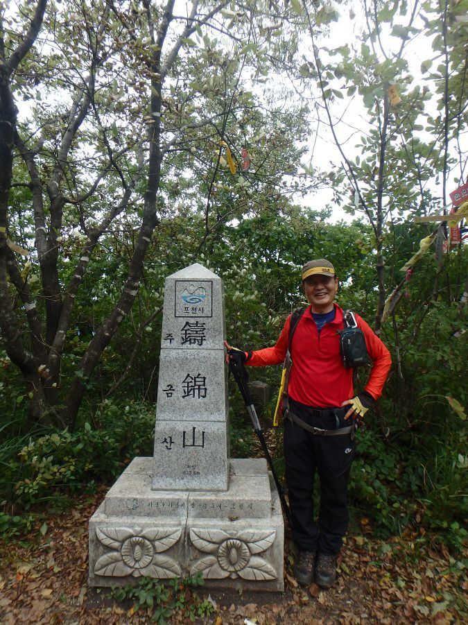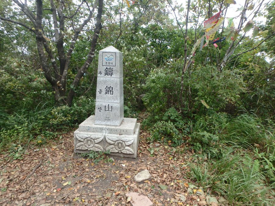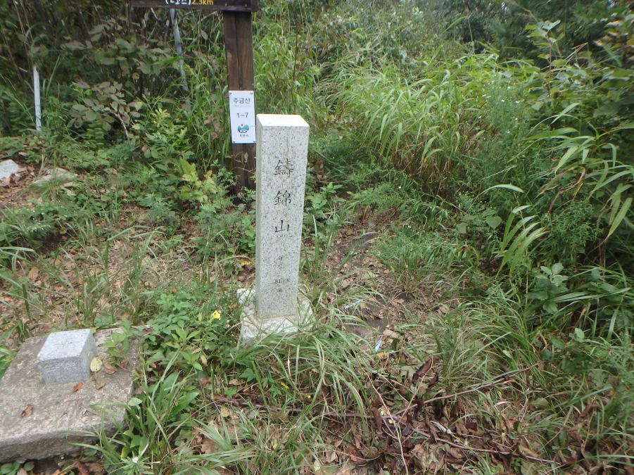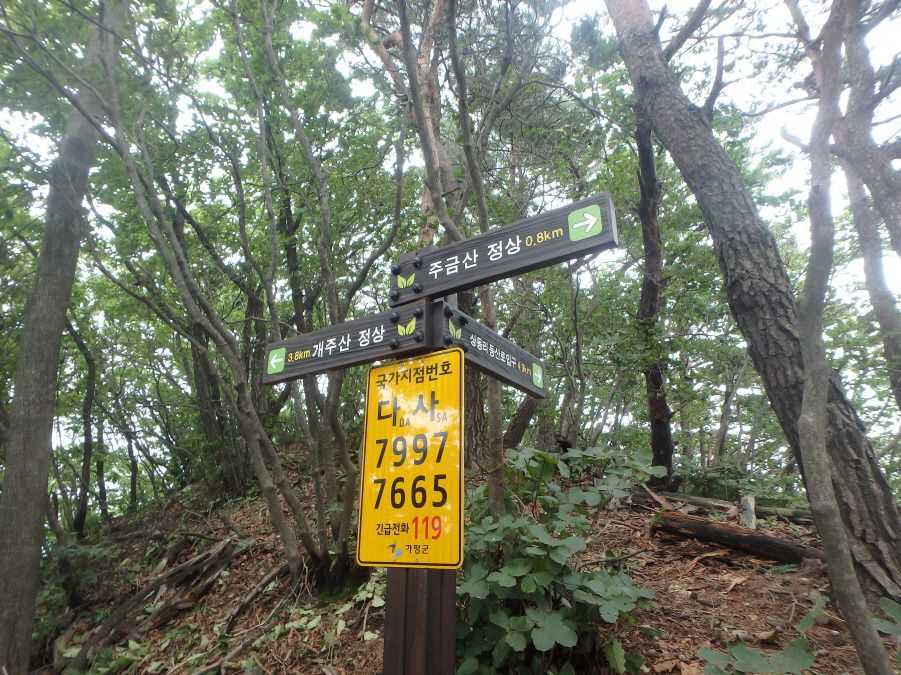 삼각점(판독불가) 있고 정상석은 2개(오래된 작은것과 새로세운 큰것) 있다. 이정표(개주산정상4.6km/수동고개2.5km/주말농장상동리2.1km)서있다. 인증사진 남기고 이정표(개주산정상4.6km) 방향 내림길 내려선다. (11;45) 등로상 우측의 바위봉을 우회하여 통과 하고 (12;09) 이정표(개주산3.8km/상동리등산로입구4.3km/주금산0.8km)를 지난다.