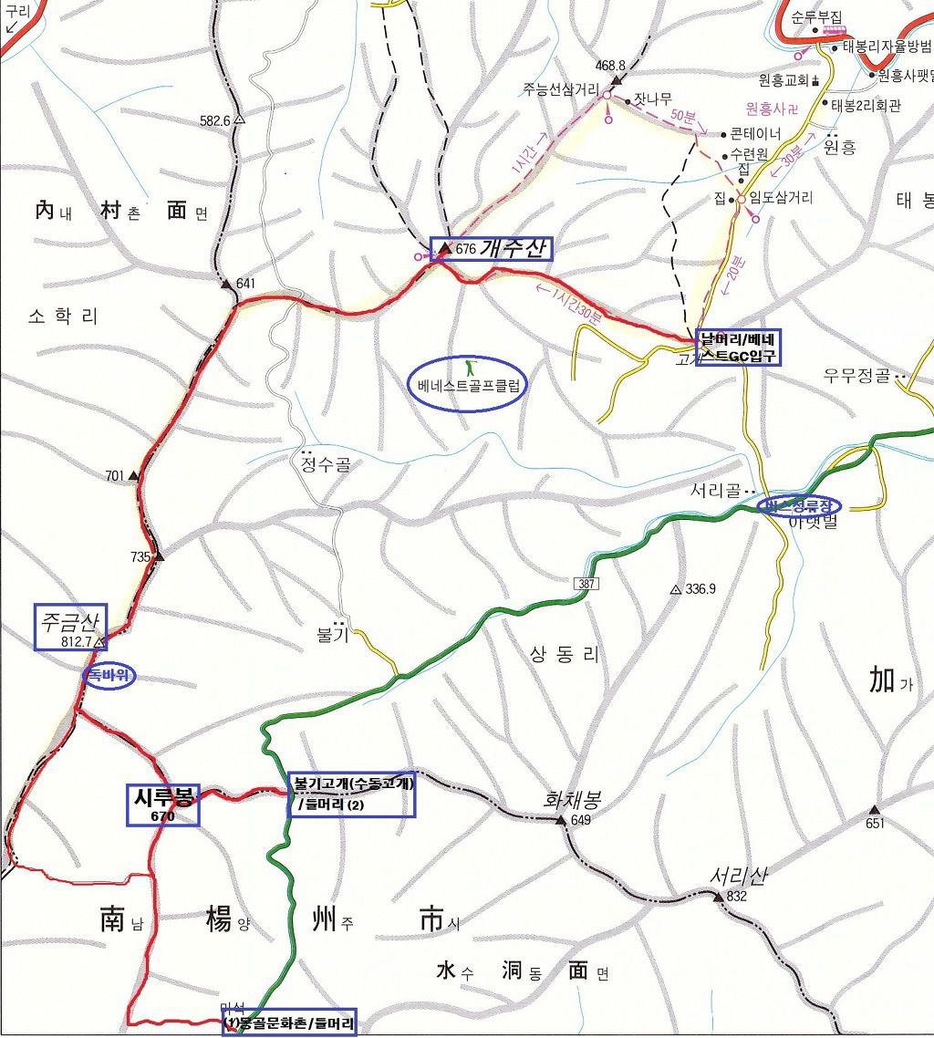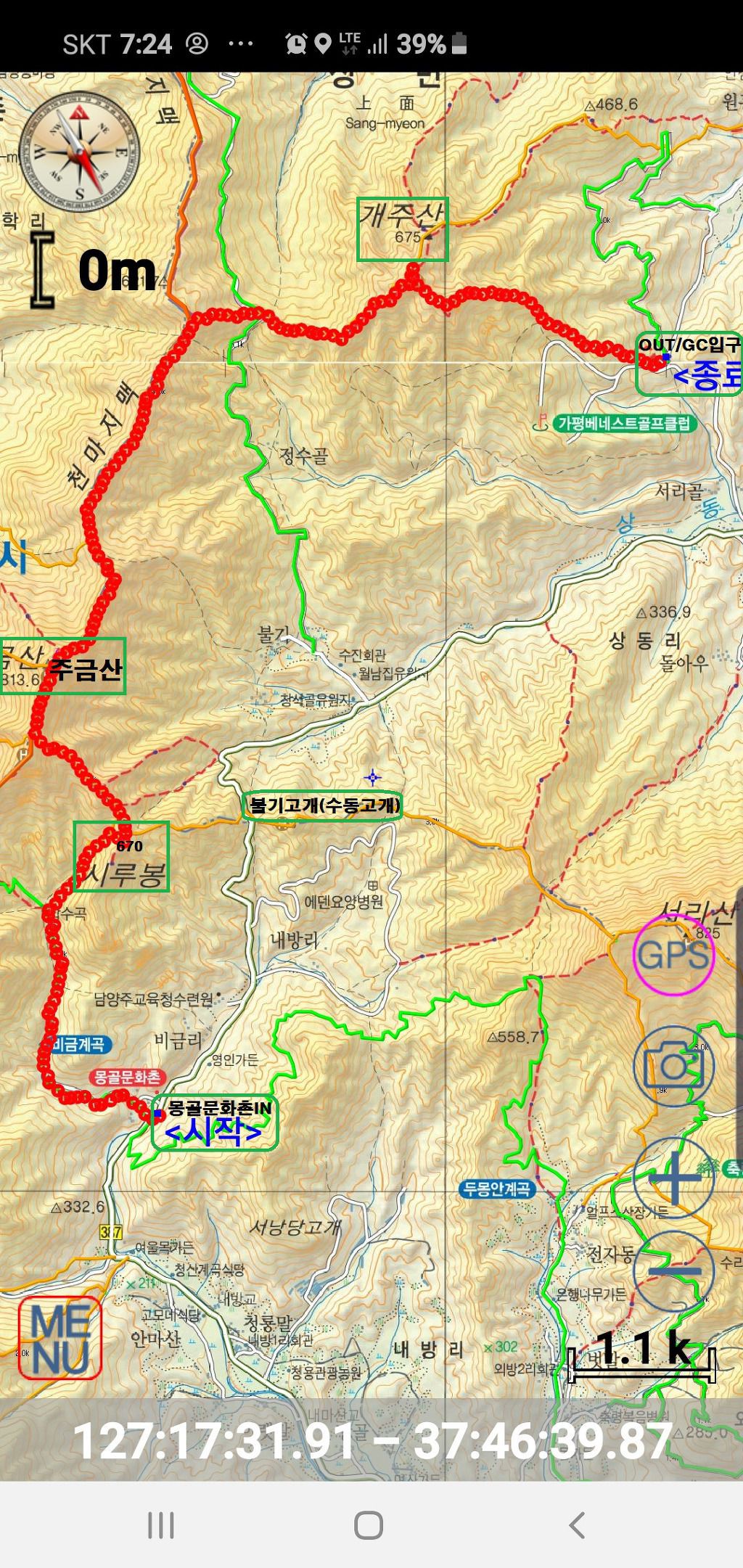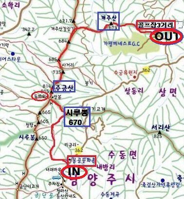 산행코스: 몽골문화촌 정류장-비금계곡 -합수곡- 1코스-시루봉(670)-2코스와 합류-헬기장-독바위-주금산 정상-735봉-701봉-641봉갈림봉(우틀)-임도-헬기장-개주산 정상-헬기장Back- 상동리향-가평 베네스트 골프장 옆 등산로입구