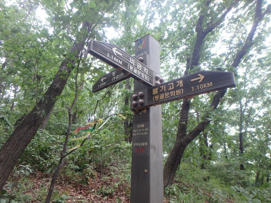 (10;41)불기고개 갈림 3거리 이정표(주금산정상1.53km/불기고개1.10km/비금리몽골문화원3.14km)입니다.
