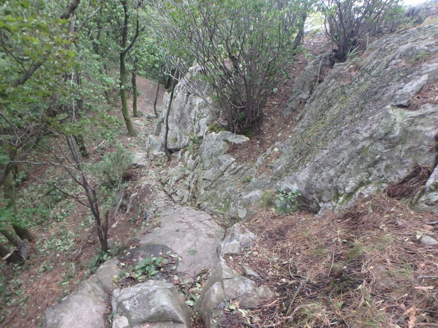 시루봉이 있는 1코스를 택한다. (cf.2코스는 거리도 짧고 쉬운편이다.) 3번째로 개울을 건너 잘 다듬어진 등로 따라 본격적인 주금산 등로에 진입한다. (10;38)이정표(주금산정상1.48km/비금리등산로입구를 2.9km)를 지나 (10;41)불기고개 갈림 3거리 이정표(주금산정상1.53km/불기고개1.10km/비금리몽골문화원3.14km)를 지나 진행한다. (10;48)내림길 내려 이정표(주금산정상1.3km/수동고개=불기고개1.2km)를 지나고 목책계단 밟으면서 픽스로프 잡고 오름길 올라 (10;54) 상동리주말농장 갈림길 이정표(주금산정상1.1km/주말농장 상동리1.0km/수동고개1.5km)서있는 3거리봉에 오르면 시루봉이다.[1.7km][40분]