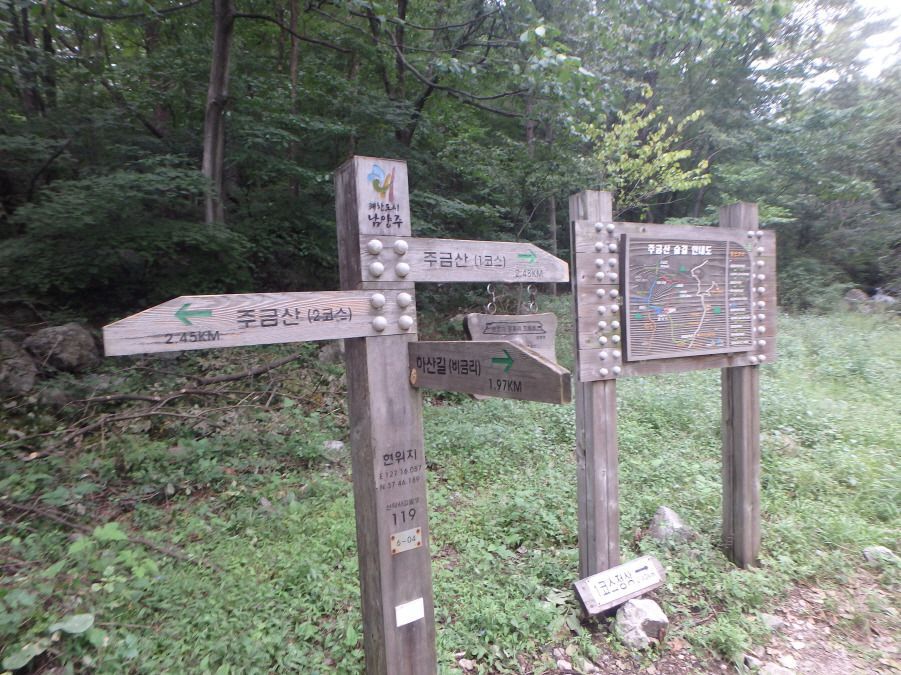 (10;15)합수곡 지점에는 주금산 숲길 안내도와 이정표(주금산1코스2.48km/주금산2코스2.45km/비금리하산길1.97km)입니다.