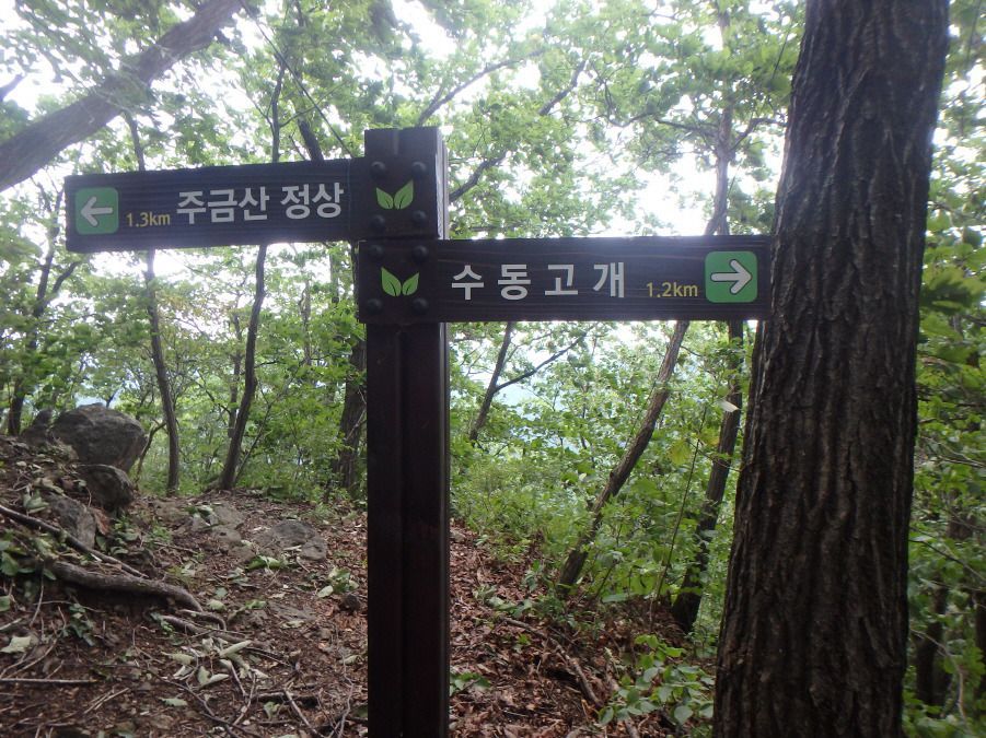 (10;48)내림길 내려 이정표(주금산정상1.3km/수동고개=불기고개1.2km)입니다.