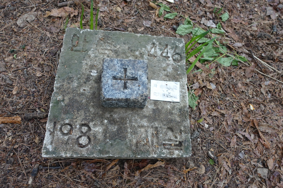 잡목이 차지하한 좁은공터다. 선답자님들의 표지기 몇장이 두루봉 정상임를 말해 준다. 빠르게 되돌아와 무명봉을 넘어가며, (11;26 ) 윤종준씨와 그부인 합장묘지를 지나고 고개에 내려선다