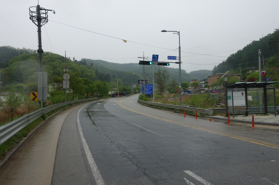 도로따라 우측으로 진행하니 3거리에 (14;21)장촌 정류소다. 조금더 도로따라 내려 장촌마을입구 버스정류소에서 산행종료한다.[1.1km][20분]