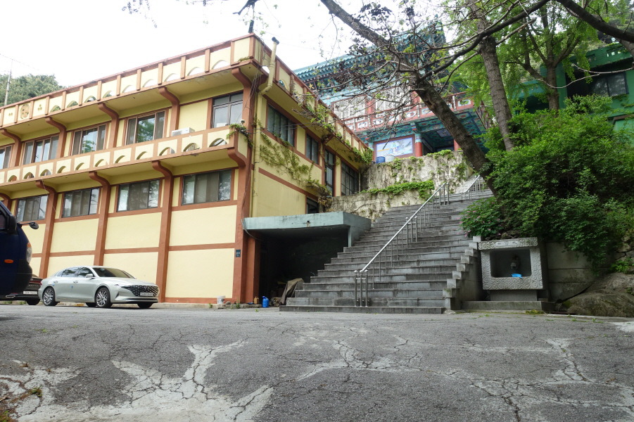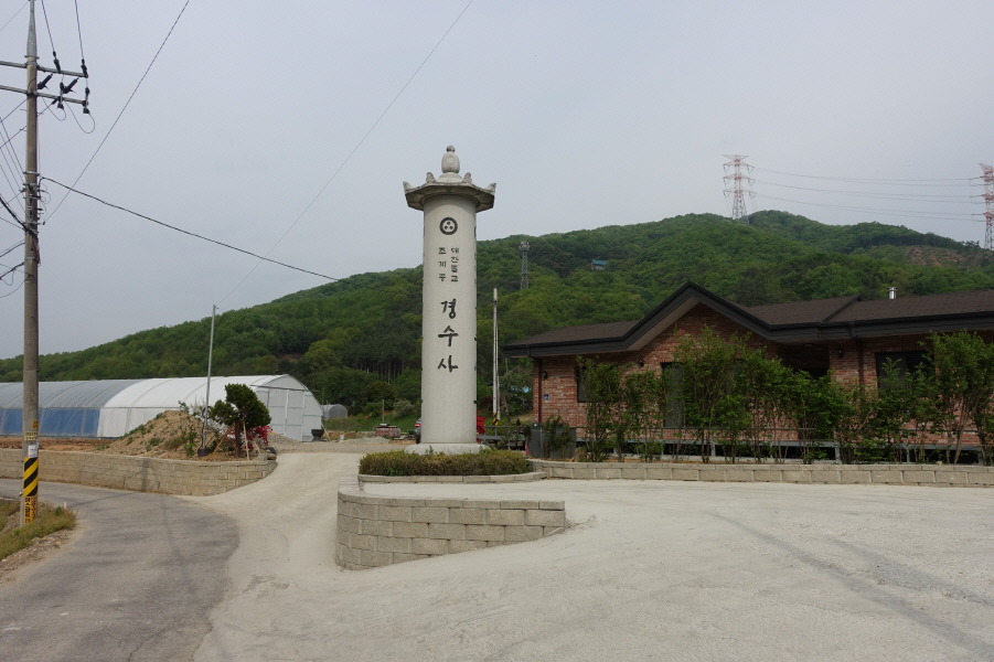사거리이다. 길 건너 산중턱에 경수사가 보인다. 커다란 경수사 표지석을 지나서 (09;11)경수교를 건너니 바로 이보목장이다. 민가 사이에 있는 용인 목신리 석조여래입상을 일별한다. 윤미목장을 지나서 (09;27) 공덕비를 지나 우측 곡각지점 (09;28)우측 공터 장작더미 땔감이 보관되어있고 커다란 불상이 있다. 그리고 포장도로를 따라서 올라가 (09;30)경수사에 도착한다.[1.0km][25분]