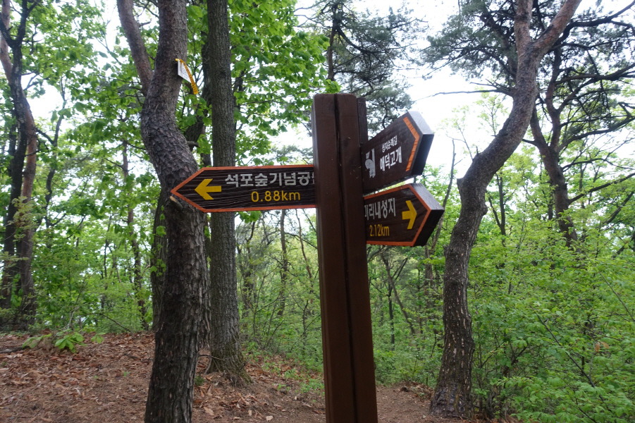 (14;05) 이정표(주차장0.86km/주차장국도1.56km/에덕고개2.9km)에서 공원 데크길을 따라 내려 3거리에서 우측으로 황토길 밟고 다시 좌측으로 내려서(14;150설명판(석포숲기념 유실수림)을 지나 내려 서면 (14;18) 국도 도로에 내려선다.