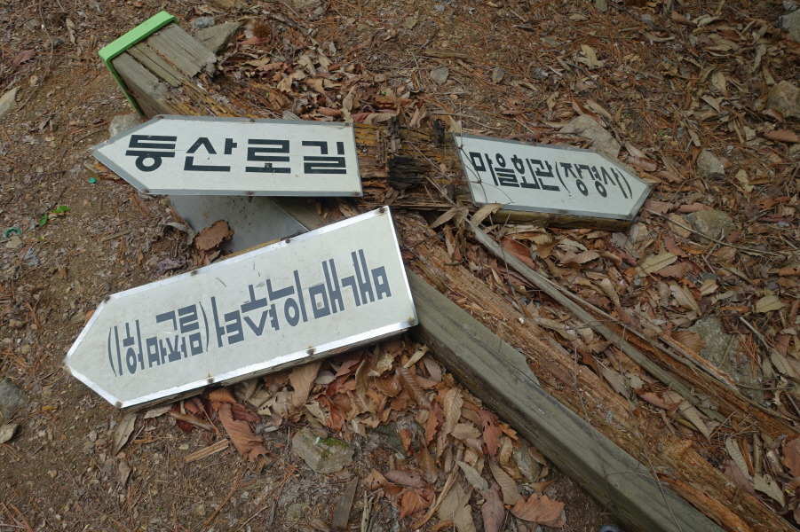 (12;29)썩어 쓰러진 이정표<마을회관(장경사)/ 배내미약수터(말전바위)/ 등산로길>있는 안부삼거리입니다.