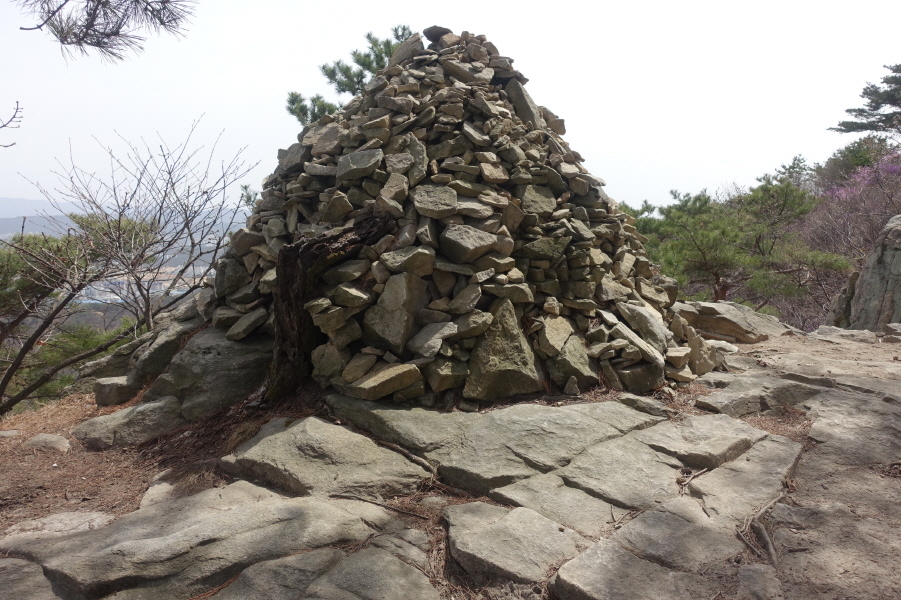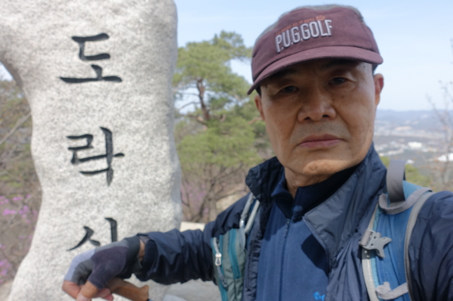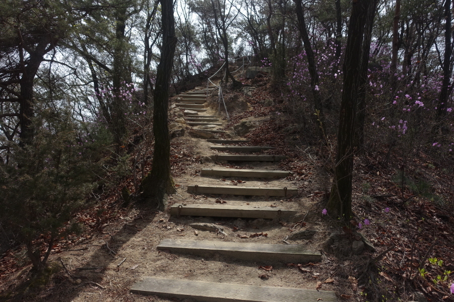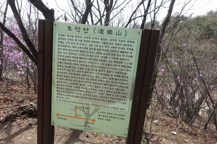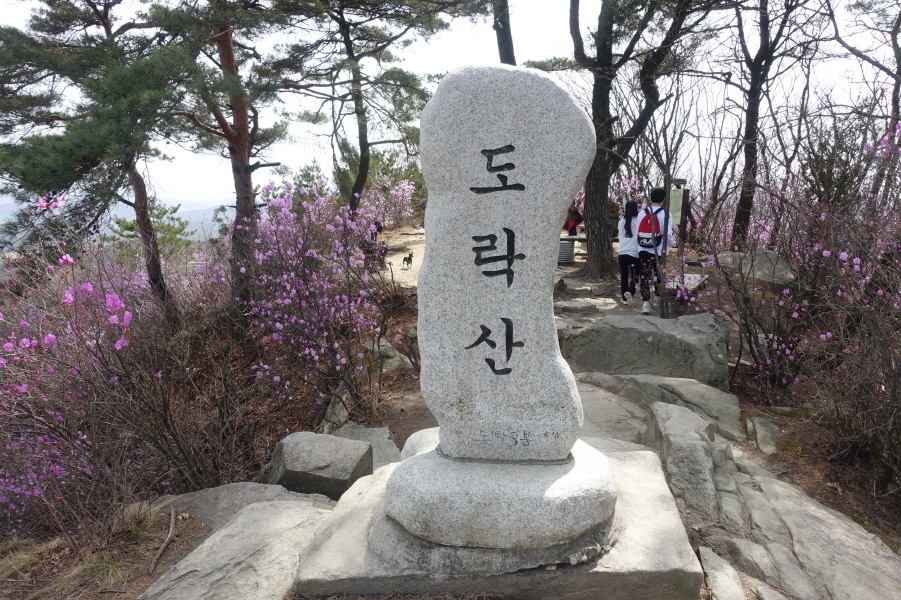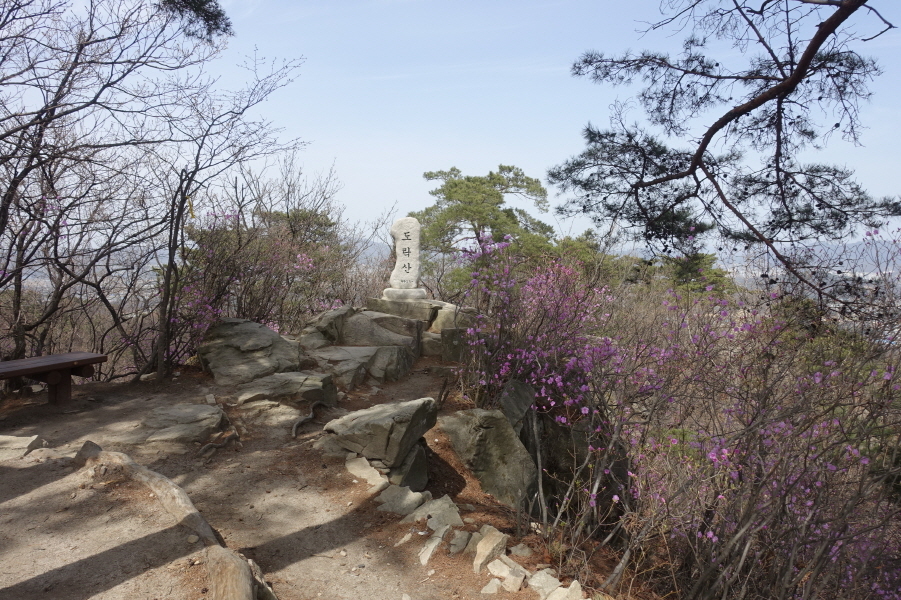 (13;00)진달래가 만개한 급경사 오름길 오른다. (13;02)목책계단 힘들게 오르고 (13;05) 커다란 바위가 위압적으로 정상에서 내려다보이는 픽스로프 가이드 설치된 계단길을 휘돌아 오르니 (13;08)돌탑1기가 있는 공터다. 공터에서 능선길 잠시 이어가니 (13;10) 도락산 정상이다.[1.5km][38분]