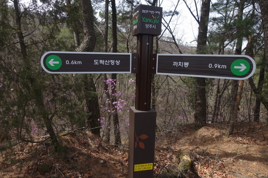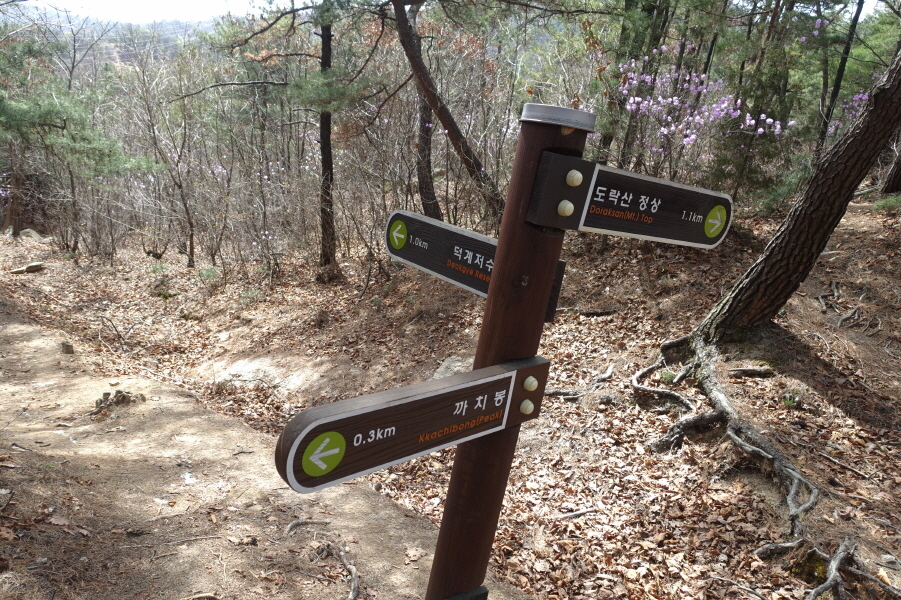 (12;09)덕계고 갈림이정표(까치봉1.0km/도락산정상2.7km/덕계고1.8km/세봉재0.4km)를 지나 내림길 내려서 (12;18)한전철탑을 통과하고 푸른 잣나무 터널을 지난다. (12;21)사마발약수터 갈림길 이정표(까치봉0.4km/도락산정상2.1km/사마발약수터0.1km/덕계고2.5km/회정동.탑동2.5km)를 만나고 (12;28) 목책계단을 밟고 등로 따라 오름길 오른다. (12;30)까치봉 정상이다.[1.4km][28분]