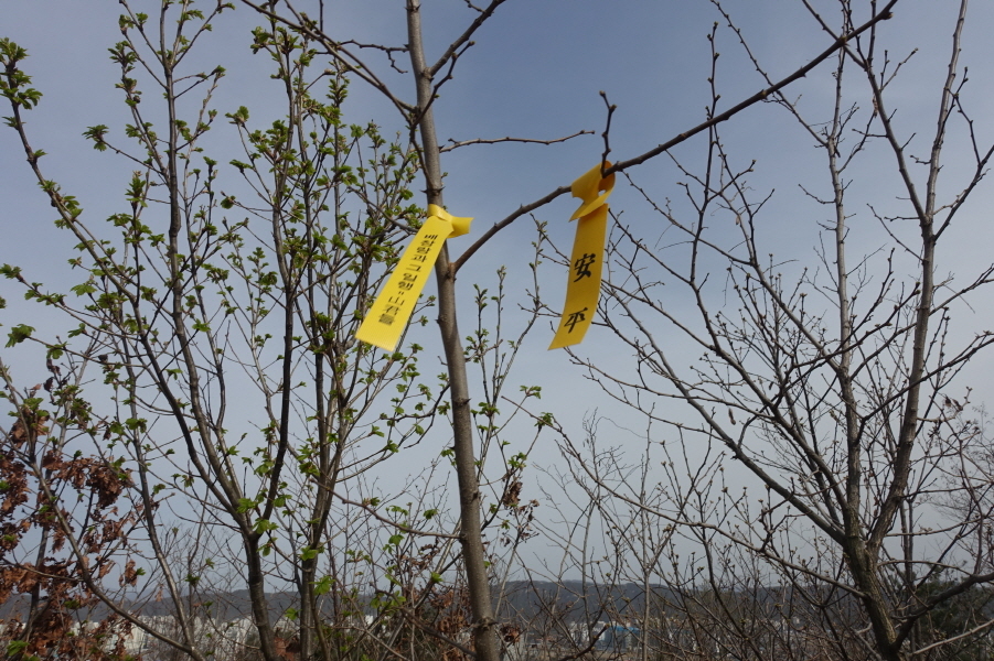 '배창랑과 그일행=山君들'표지기 걸고 선답자님들(김신원회장님.안평님.만산동호회)의 표지기와 함께 카메라에 담고 하산길에 든다. 왔던길을 되돌아 (15;13)전망대에서 다시 전망 즐기고 능선갈림길에서 임도따라 덕계역을 향한다. (15;17)이정표(삼희아파트.덕계역방면0.1km/고덕배수지2.0km/한진에네빌아파트2.1km/옥정배수지1.0km/고장산정상1.0km)를 지나 아스팔트도로에 내려선다. 도로 따라서 진행 버스정류소에서 잠시 스틱 접고 베낭 정리한후 신호건너 덕계역에서 산행종료 한다.[1.2km][20분]