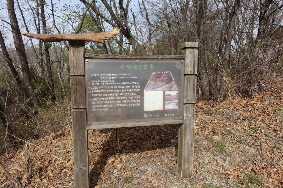 조금전 이정표상 '고장산 0.6km'는 고장산 정상이 군사시설로 되어 있을때 좀 더 진행하여 만나는 낮은 봉우리를 고장산 정상으로 대신할때 표시이고 지금은 바로 정상을 찾은 셈이다. 고장산은 덕계리 및 양주읍 고읍리와 경계를 이루는 산이다. 주변에는 고장동이란 마을이 있다. 일명 태봉(胎峰)이라고도 한다. 신증동국여지승람(1530년) 이후 여러 자료에 등장하는 갈립산으로 추정되는 산으로 이곳에서 옥(玉)이 생산되었다는 기록이 있다.