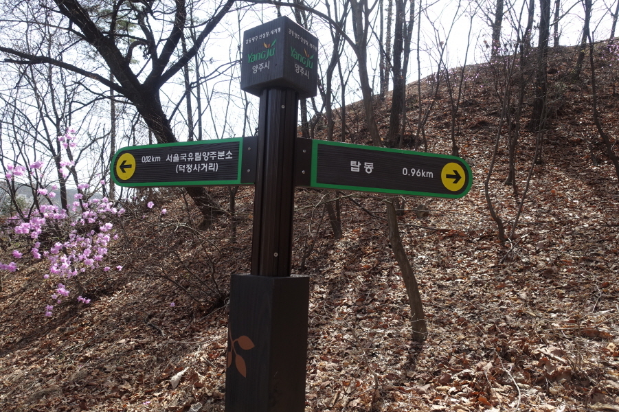 (11;22) 이정표(탑동0.41km/양주경찰서민원실0.35km/서울국유림양주분소0.57km)를 지난다. 조금더 진행하니 (11;25) 이정표(탑동0.06km/서울국유림양주분소0.57km)서있고 (11;35)탑동마을 도로에 선다.[1.5km][27분]