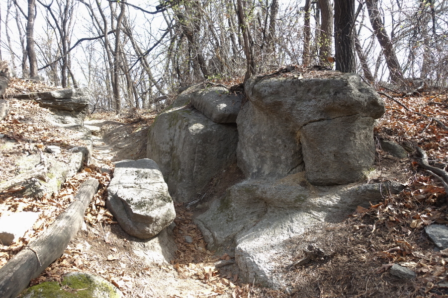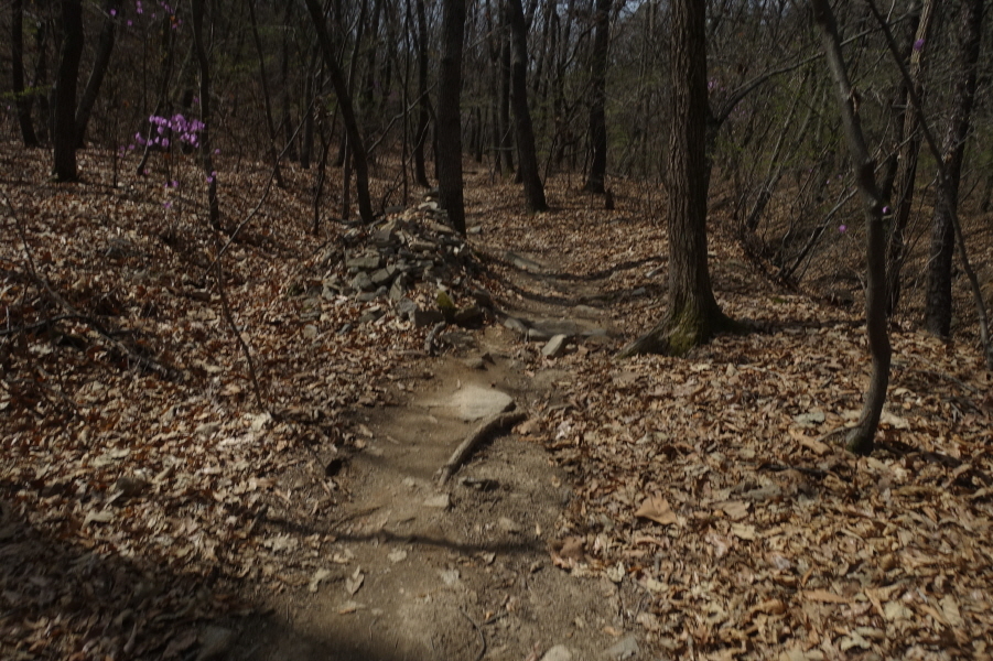 (13;35)국립공원에나 있을 법한 등산객 통제용 목책 바리케이트 구조물을 빠져 나와 부드러운 등로 따라 진행한다. 원형 테이블 쉼터를 지나 3거리에서 직진길은 298봉을 지나 한북정맥 능선길로 연결되나 한북정맥길은 2번이나 지난 길이기에 좌측으로 조금은 덜 발달된 등로 따라 큰지장골로 내려선다.