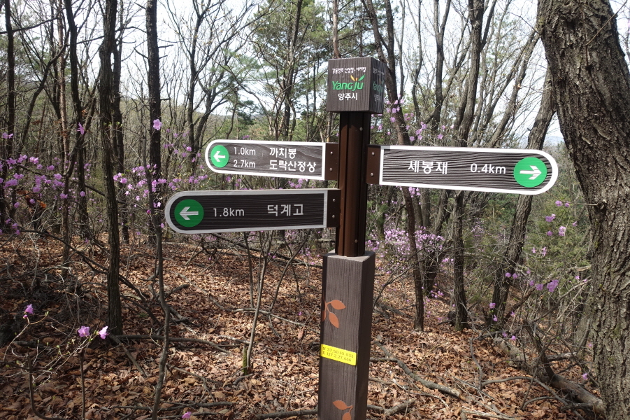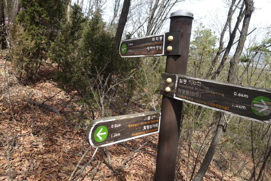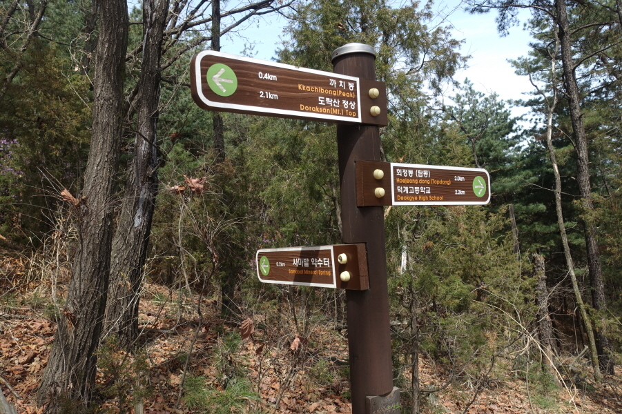 (12;21)사마발약수터갈림길 이정표(까치봉0.4km/도락산정상2.1km/서마발약수터0.1km/덕계고2.5km/회정동.탑동2.5km)입니다.