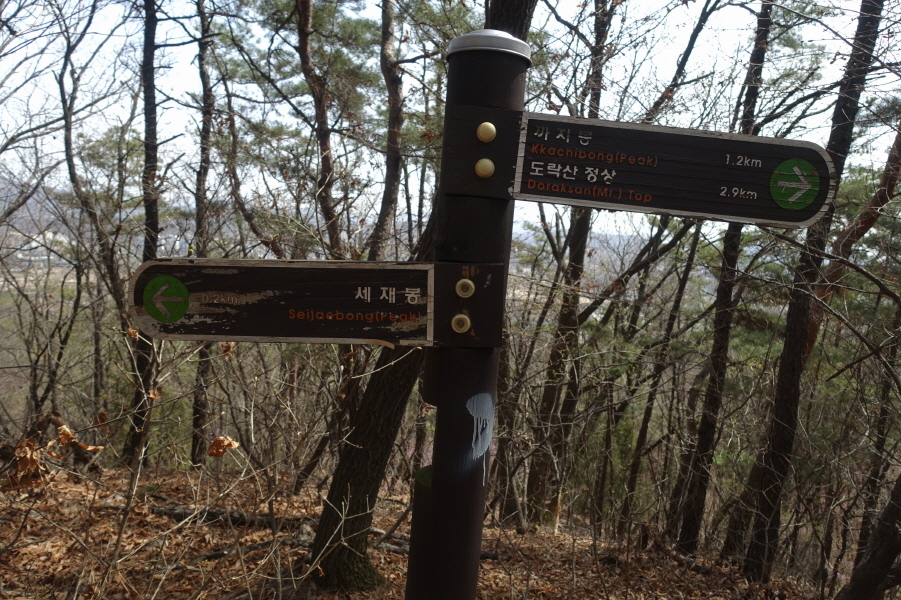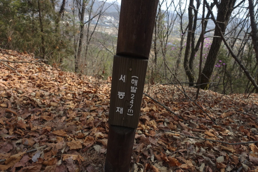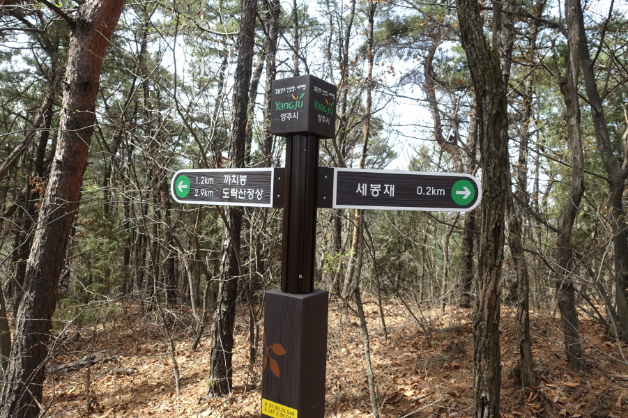 (11;35) 좀더 밑에서 올라오는 좋은 등산로 만나 완만하게 오른다. (11;50)탑동약수터 갈림 이정표(까치봉1.6km/도락산3.3km/탑동약수터0.6km/괴골약수0.5km/회정3거리1.3km/회정동.탑동1.4km)를 만난다. 우측 군부대 울타리 근처에 탑동약수터가 있나보다. (11;53)이정표(까치봉1.4km/도락산정상3.1km/탑동약수터0.2km/버스타는곳1.3km/회정동.탑동1.0km/버스타는곳1.4km)를 만나고 갈림길에서 직진으로 오름길 올라서니 (12;00)이정목에 '서봉재247m' 부착된 이정표(정상2.4km)를 만나고 이정표(정상2.4km)반대 방향(정상은 도락산을 의미한 듯?)으로 5m 정도 오르니 세재봉이다.[1.5km][30분]