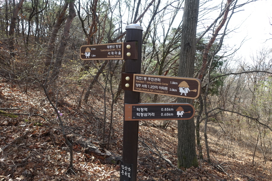 (10;13) 이정표(태봉산 정상 0.1km/ 서재마을 1.3km/ 회천1동 주민센터 1.5km/ 양주 서희1/2단지아파트 2.0km/덕정역0.85km/덕정3거리0.65km)입니다.