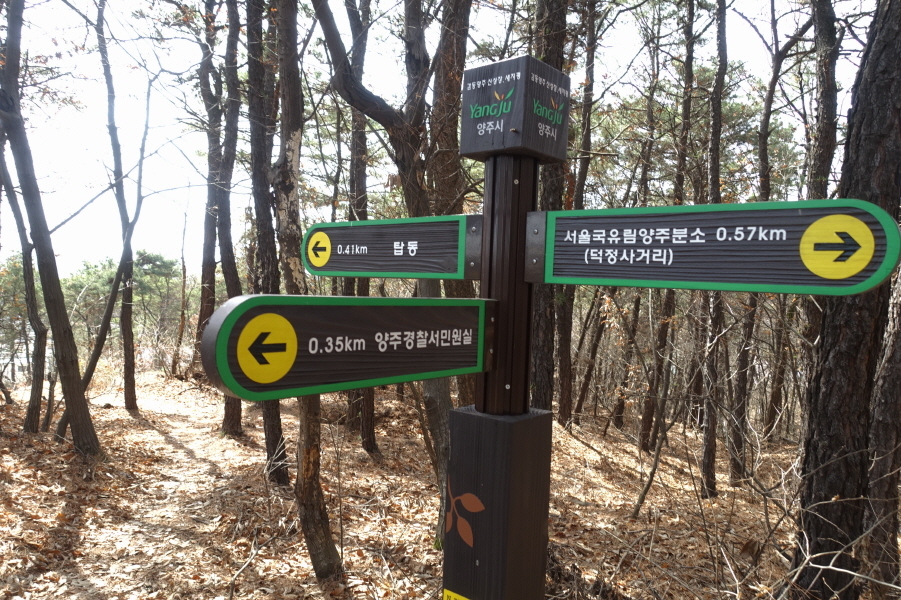 (11;22) 양주경찰서민원실 갈림 이정표(탑동0.41km/양주경찰서민원실0.35km/서울국유림양주분소0.57km)입니다.
