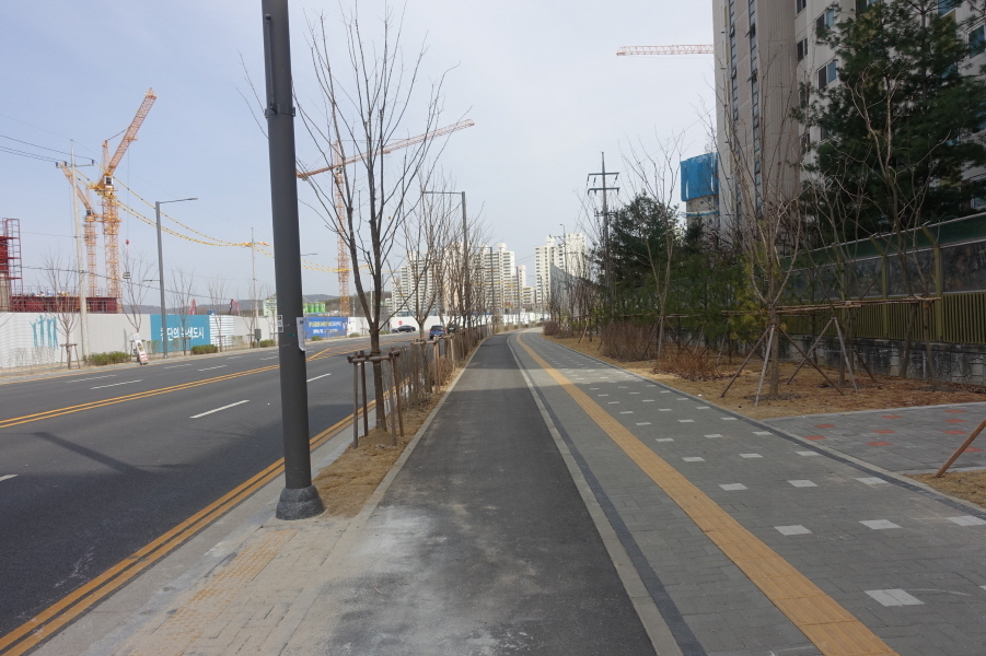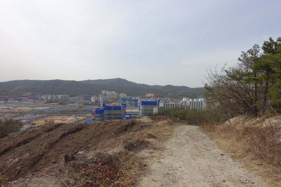 청소년 수련원 가는 도로다. 좌측으로 도로따라 내려선다. (12;54) 지장사 표지석 서있는 지장사입구를 지나고 (14;04~14;06) 덕계저수지를 지난다. 덕계마을 도로 따르고 덕계천변 데크길 따라 진행한다. 신도시 공사현장길을 따라 (14;30)덕계역 4거리에 도착한다.[3.5km][40분]