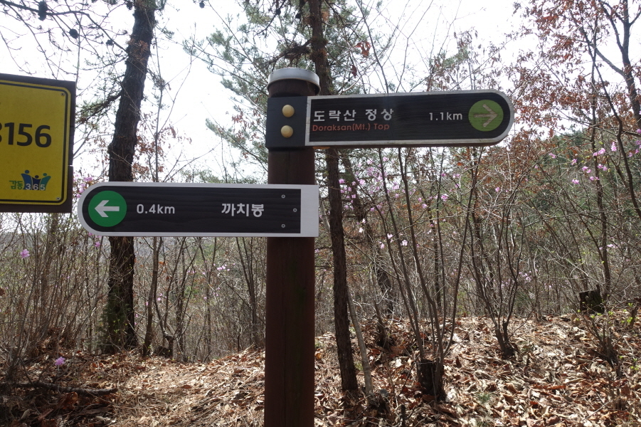 잠시 조망 즐기고 내림길 내려서 (12;34)이정표(도락산정상1.46km/마당바위쉼터0.7km/덕계고2.87km)를 지나고 등로 우측으로 비포장임도에 차량들이 서있는 등로따라 오른다. (12;40)이정표(도락산정상1.1km/덕계저수지1.0km/까치봉0.3km). (12;41)이정표(도락산1.1km/까치봉0.4km). (12;46)이정표(도락산0.9km/까치봉0.6km).(12;55)이정표(도락산0.6km/까치봉0.9km)들을 지난다.