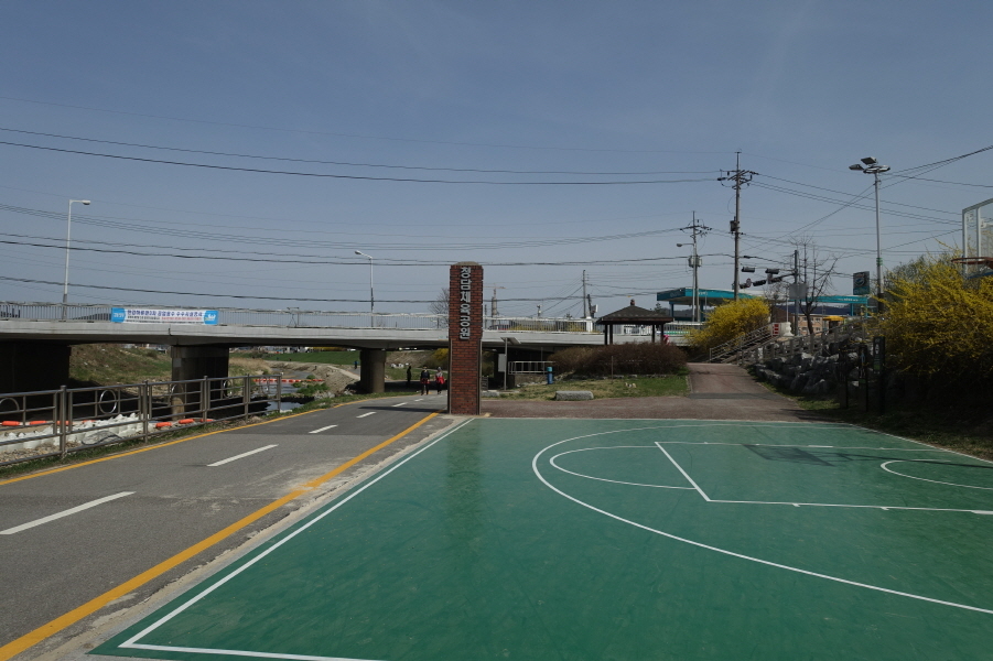 아무런 표시 없는 우향 청담천변 아스팔트포장 자전거도로를 따른다. (뚝방길을 따라도 되지만 혹여 덕암교 전에 청담천을 건너는 다리가 있을가 싶어 뚝방길 밑 자전거도로를 따른다.) 청담천은 수로 공사중이다. (10;51)청담체육공원을 지나 뚝방길과 연결되어 덕암교에 선다.[1.5km][20분]